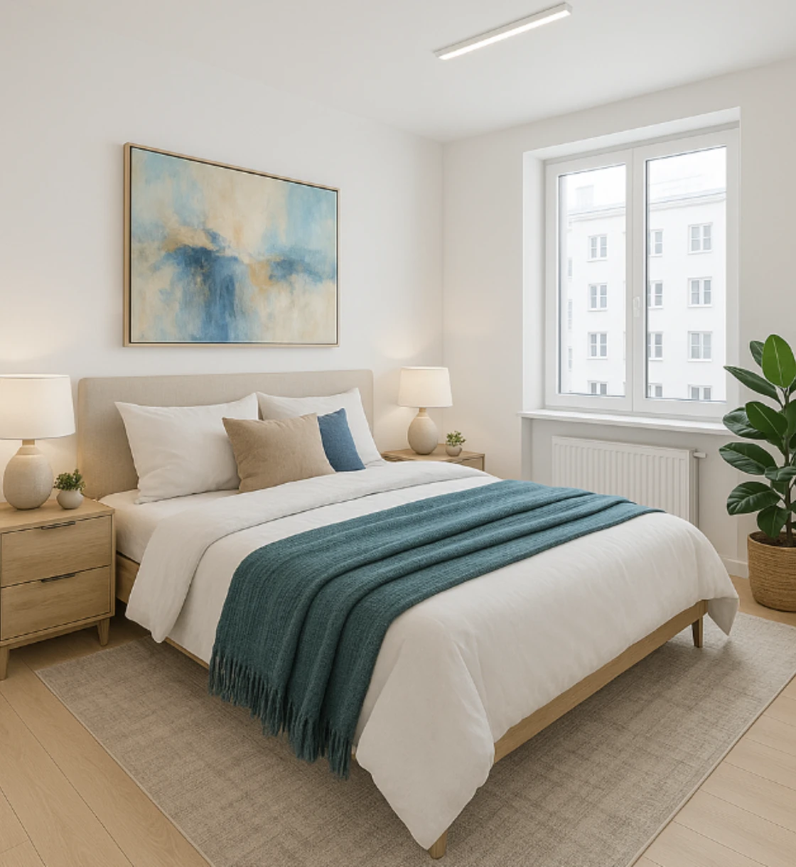 Tông trắng chủ đạo kết hợp gỗ sáng và ánh sáng tự nhiên giúp không gian luôn thoáng, rộng và thư giãn