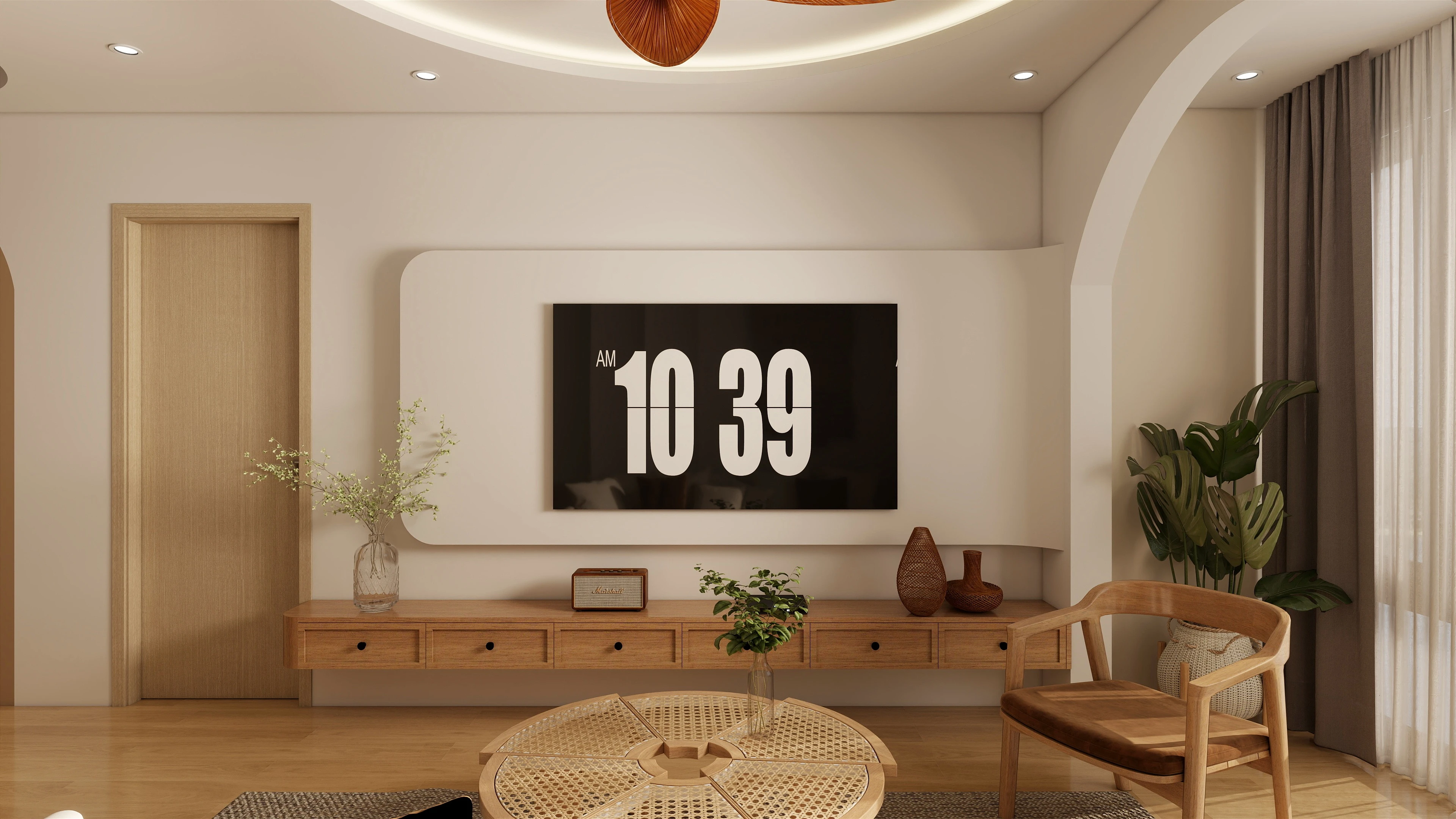 🪑 Mảng tường cong ôm trọn màn hình TV – tối giản nhưng khác biệt