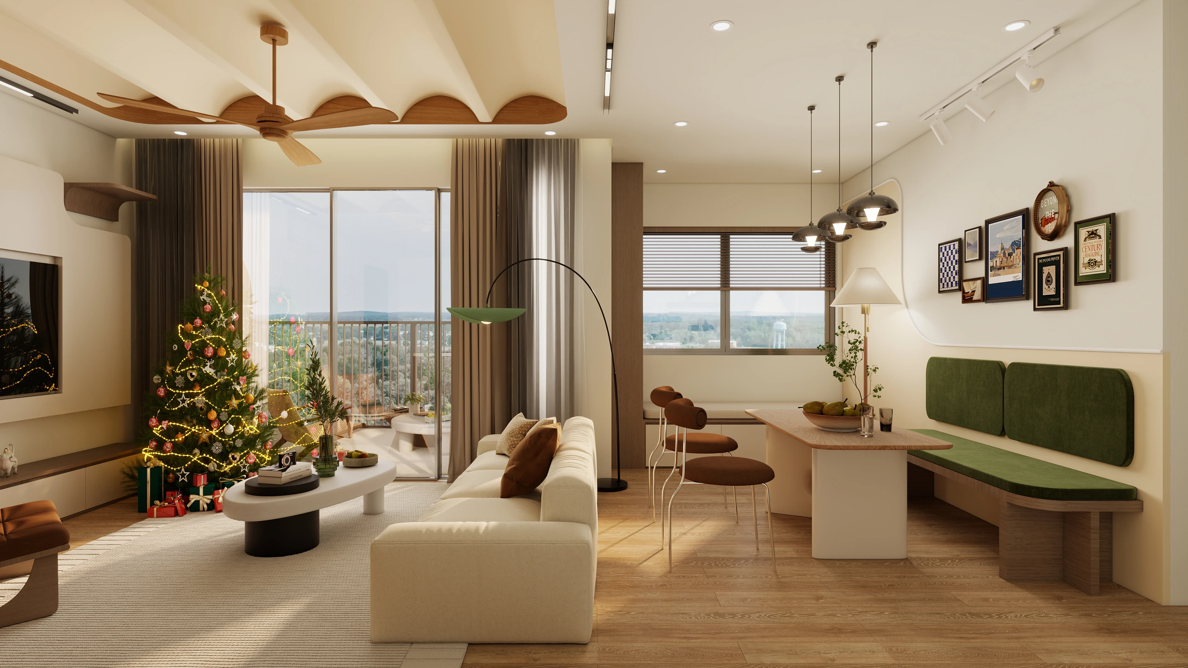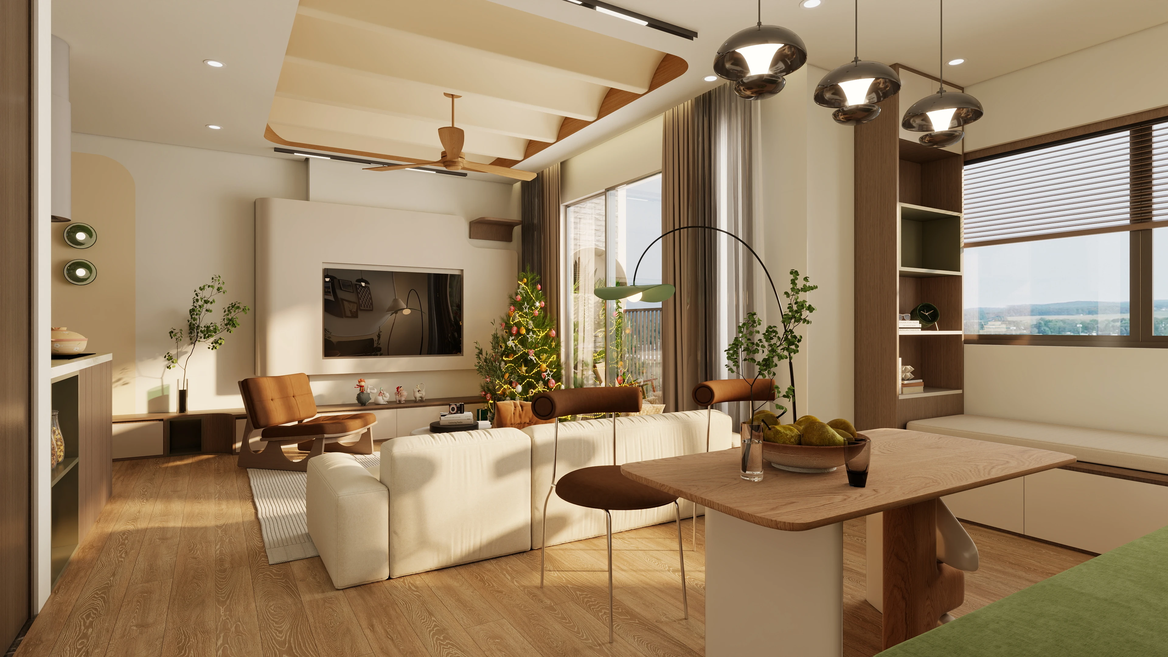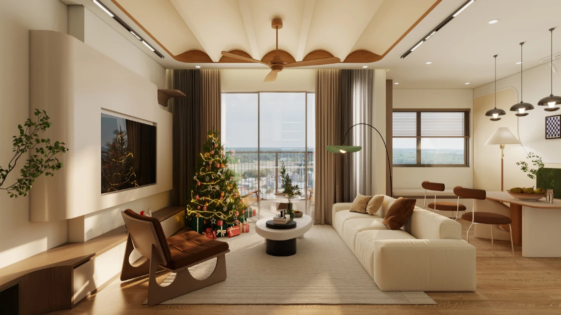 Tông màu ấm áp kết hợp vật liệu gỗ tự nhiên, vải thô, đường nét bo cong và ánh sáng chan hòa tạo nên một không gian sống gần gũi nhưng vẫn rất tinh tế.