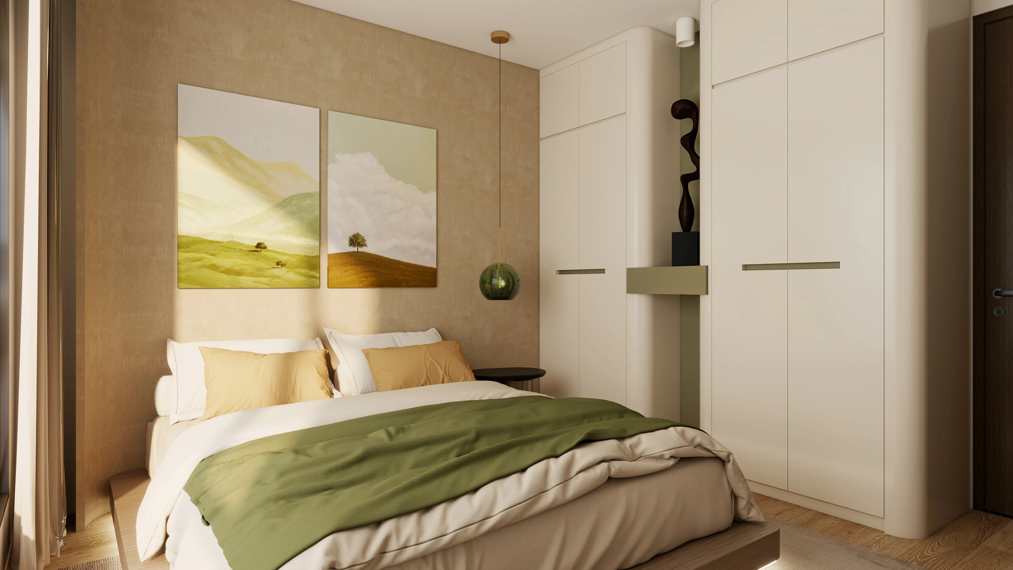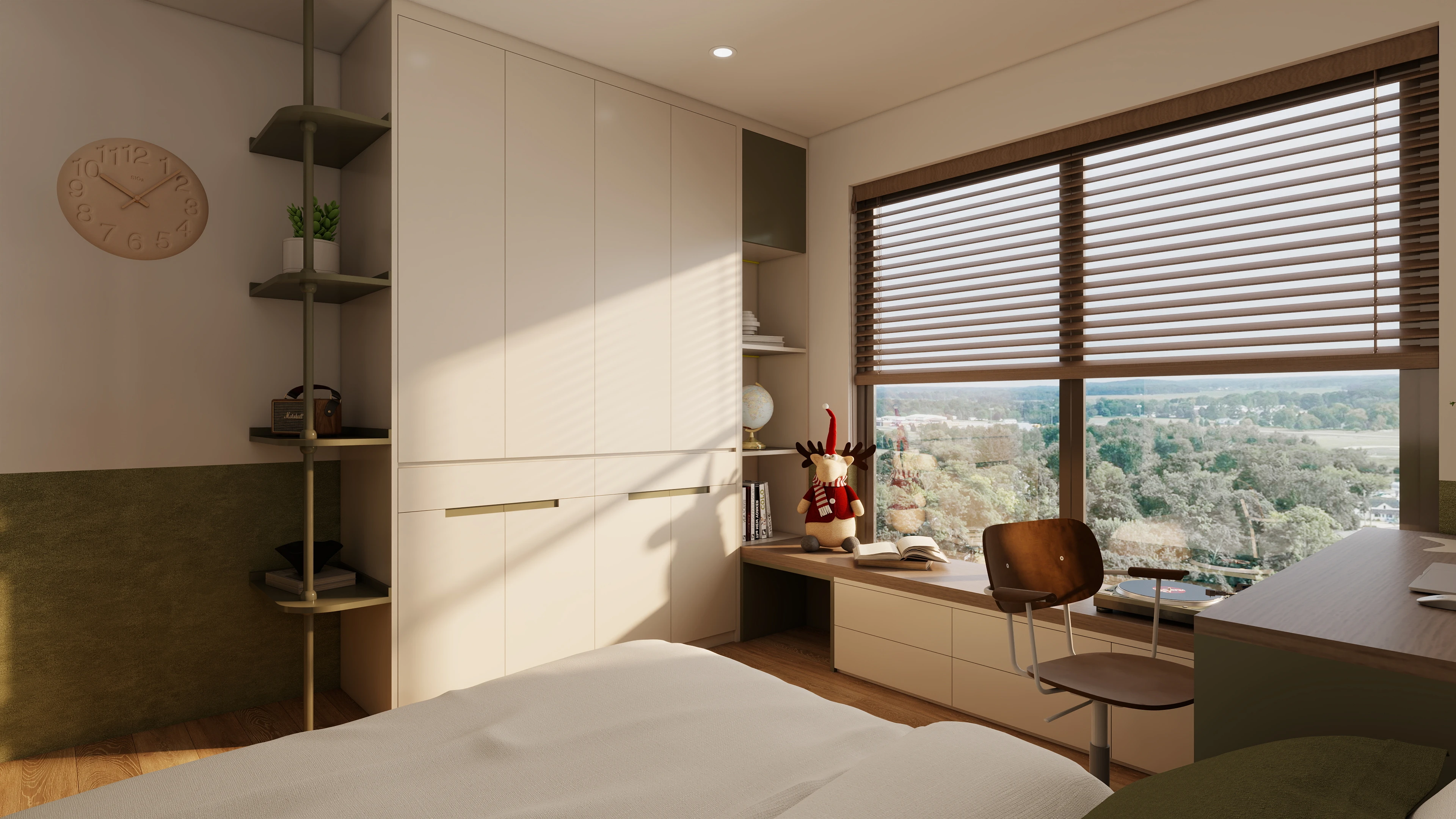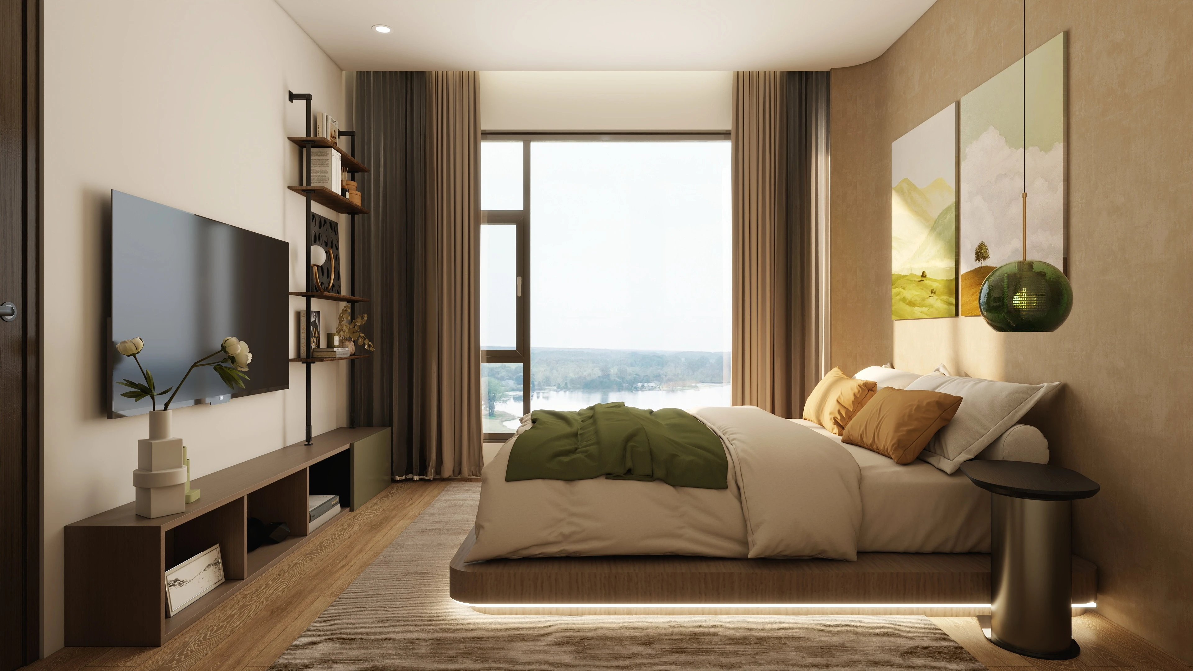 Tone màu be nhạt, trắng ngà, nâu gỗ và xanh olive nhẹ được kết hợp mượt mà để tạo nên cảm giác dễ chịu, cân bằng giữa hiện đại và thiên nhiên.