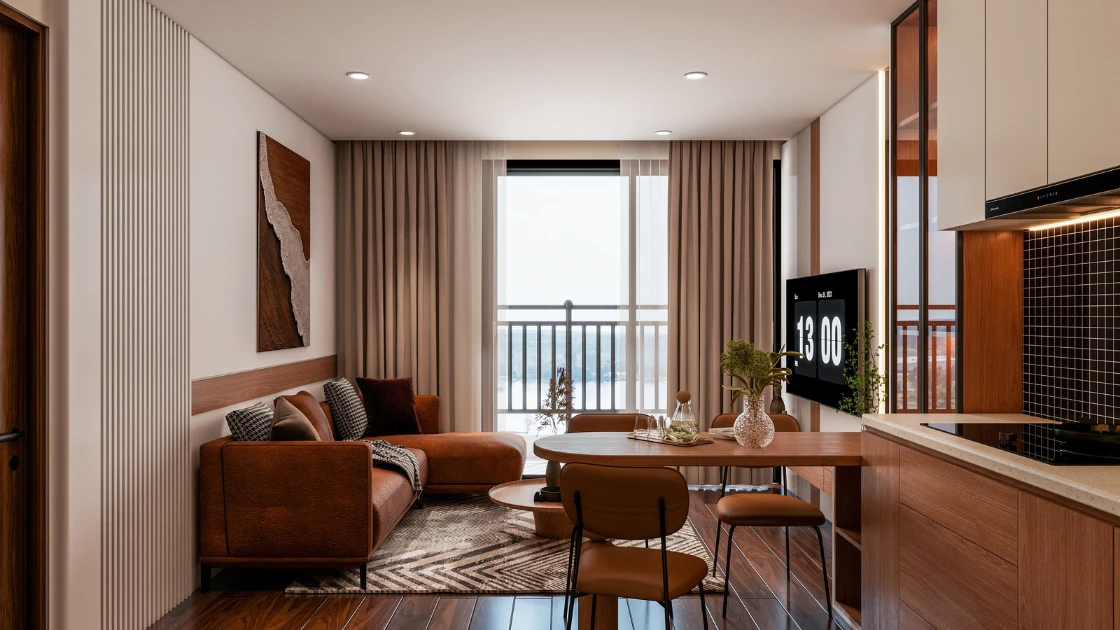 Sofa nâu đất nổi bật trên nền sàn gỗ óc chó đậm màu, kết hợp thảm họa tiết hình học và tranh tường gỗ tạo nên chiều sâu thị giác. Rèm vải beige xuyên sáng vừa giữ được sự riêng tư vừa tận dụng ánh sáng tự nhiên tối đa.