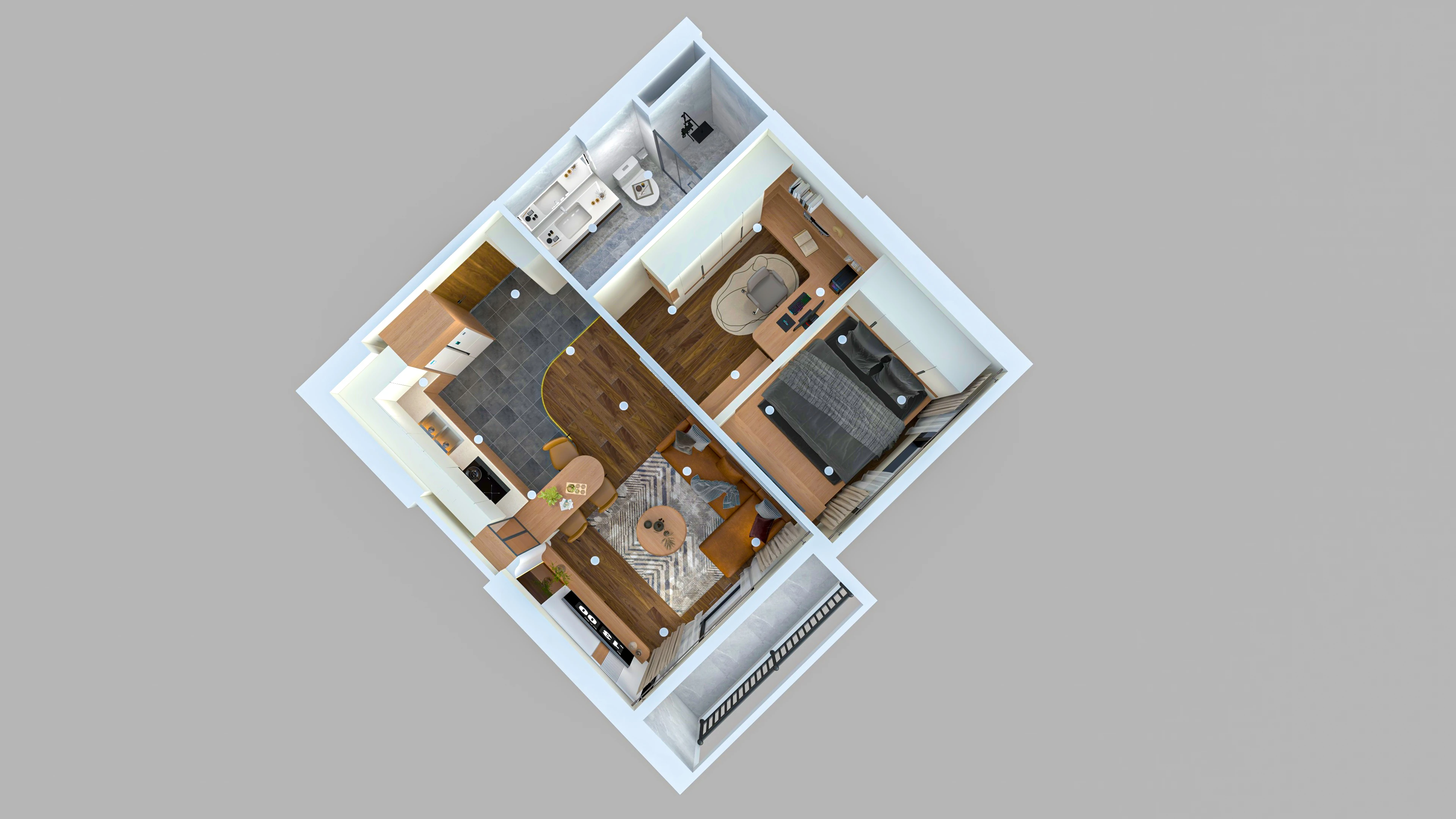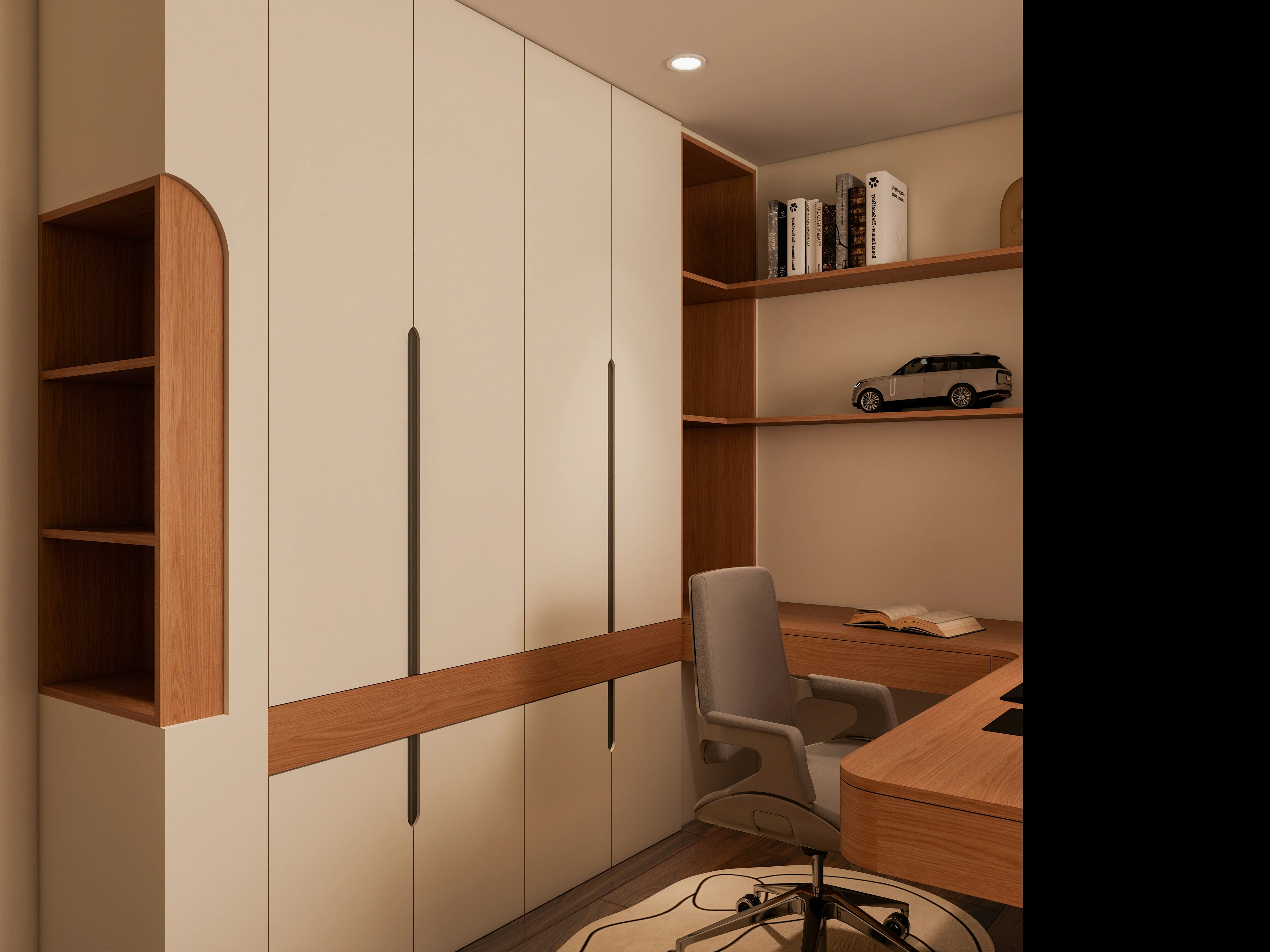 Tối ưu hóa nội thất bằng các món đồ đơn giản, tinh tế và đa năng. Mỗi chi tiết đều mang công năng rõ ràng – từ kệ tivi gọn gàng, đèn âm trần hiện đại đến các phụ kiện decor gốm thủ công.