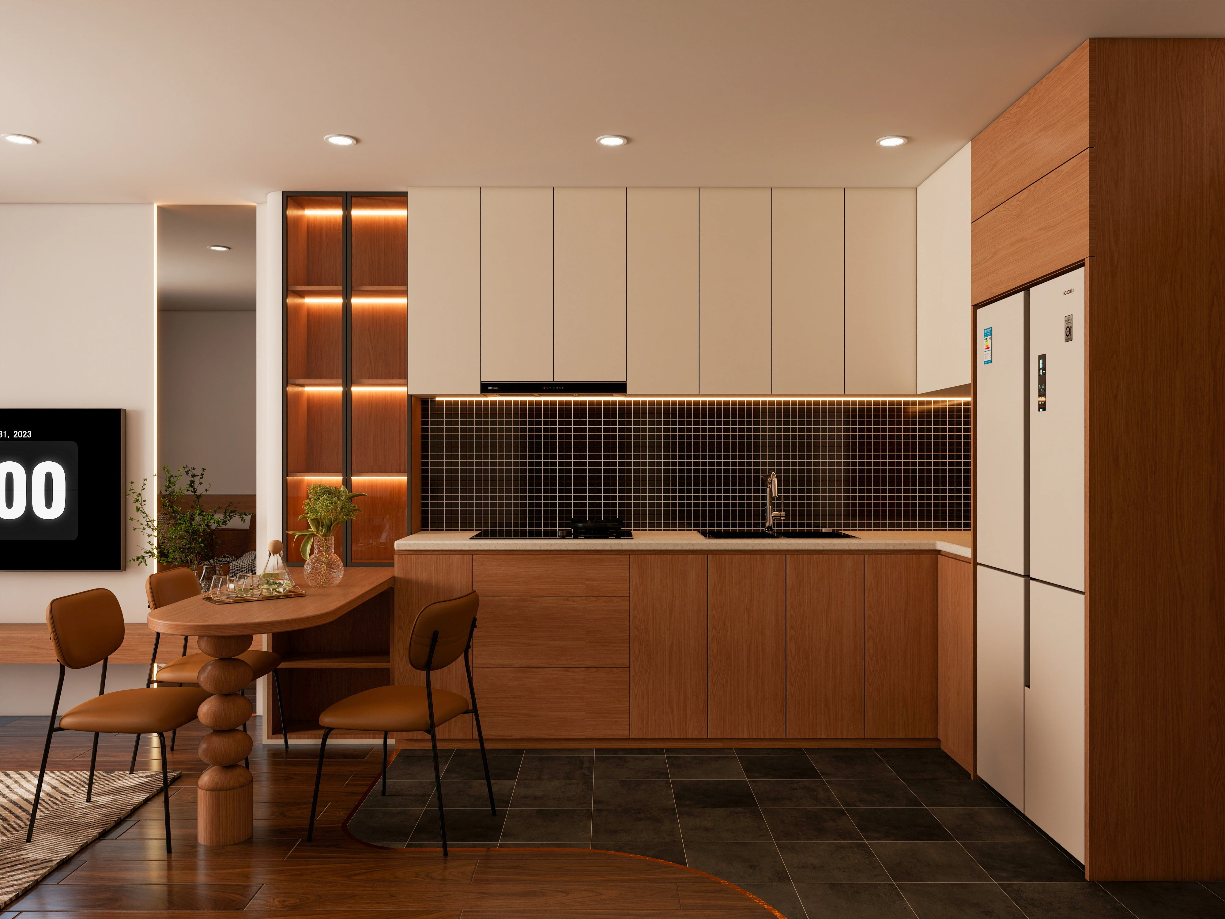 Bàn ăn nối liền đảo bếp tiện dụng, tạo nên sự liên kết liền mạch trong không gian nhỏ. Mặt đá bếp và tủ gỗ veneer mang lại vẻ mộc mạc nhưng sang trọng, phù hợp tinh thần Japandi.