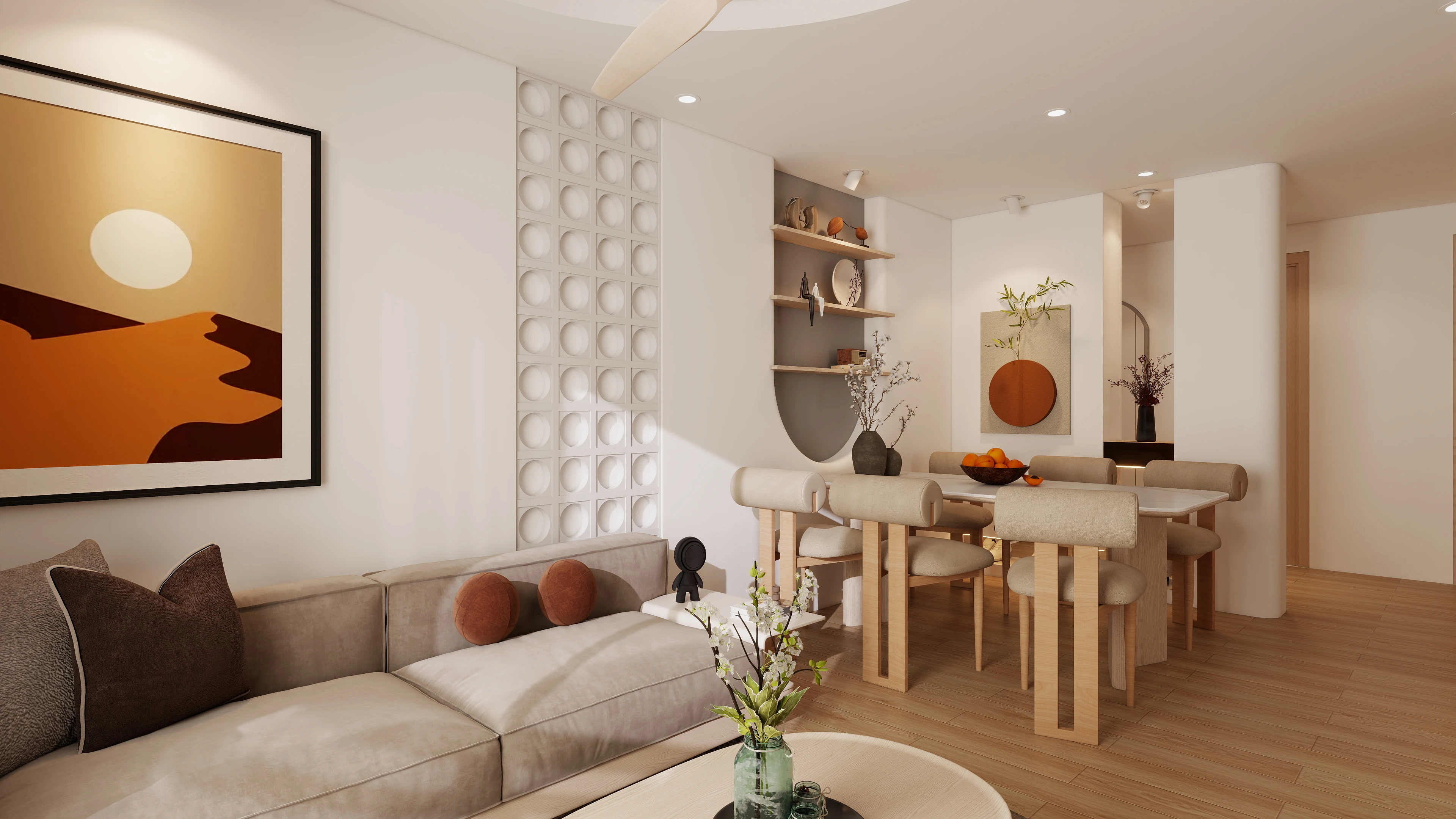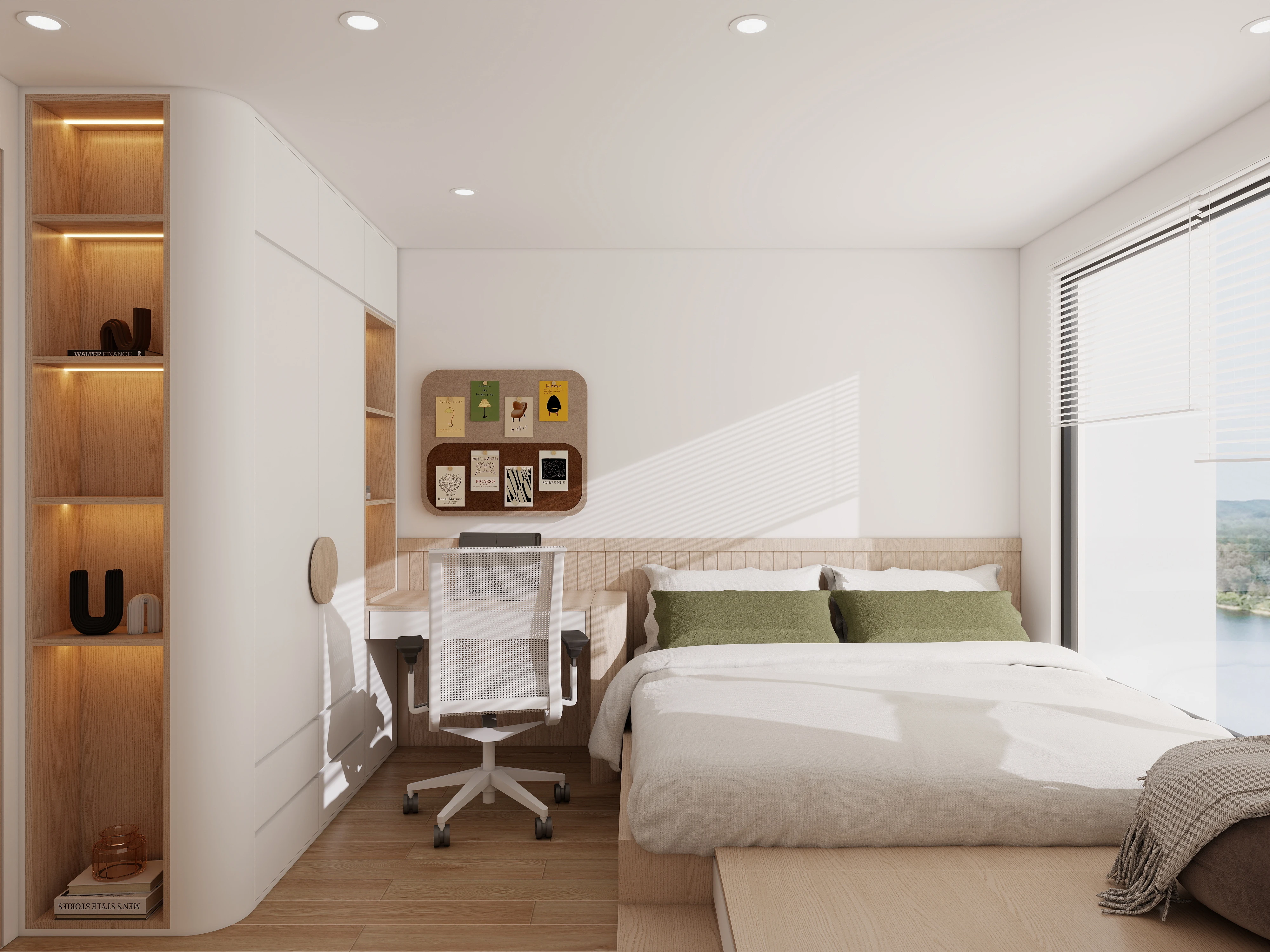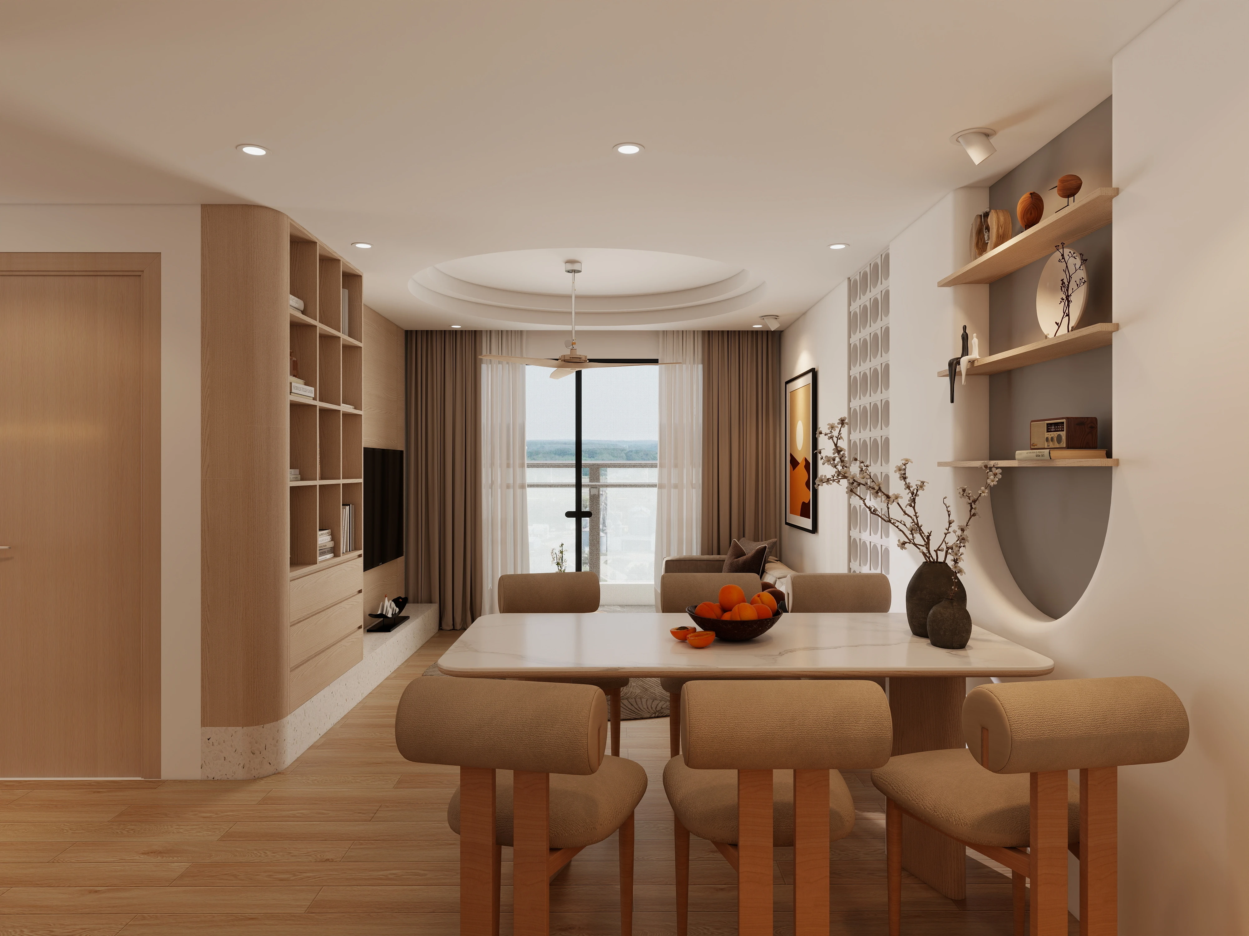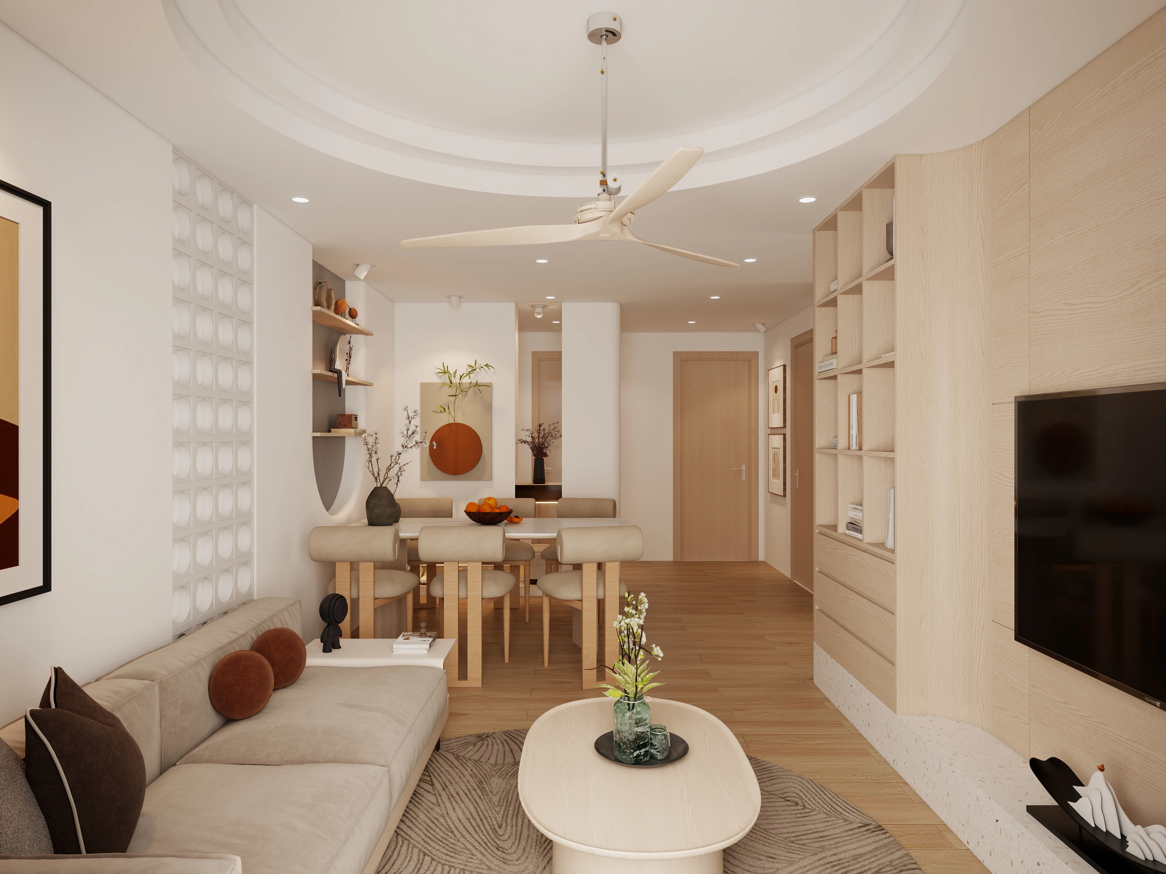 Tông màu ấm áp kết hợp vật liệu gỗ tự nhiên, vải thô, đường nét bo cong và ánh sáng chan hòa tạo nên một không gian sống gần gũi nhưng vẫn rất tinh tế.