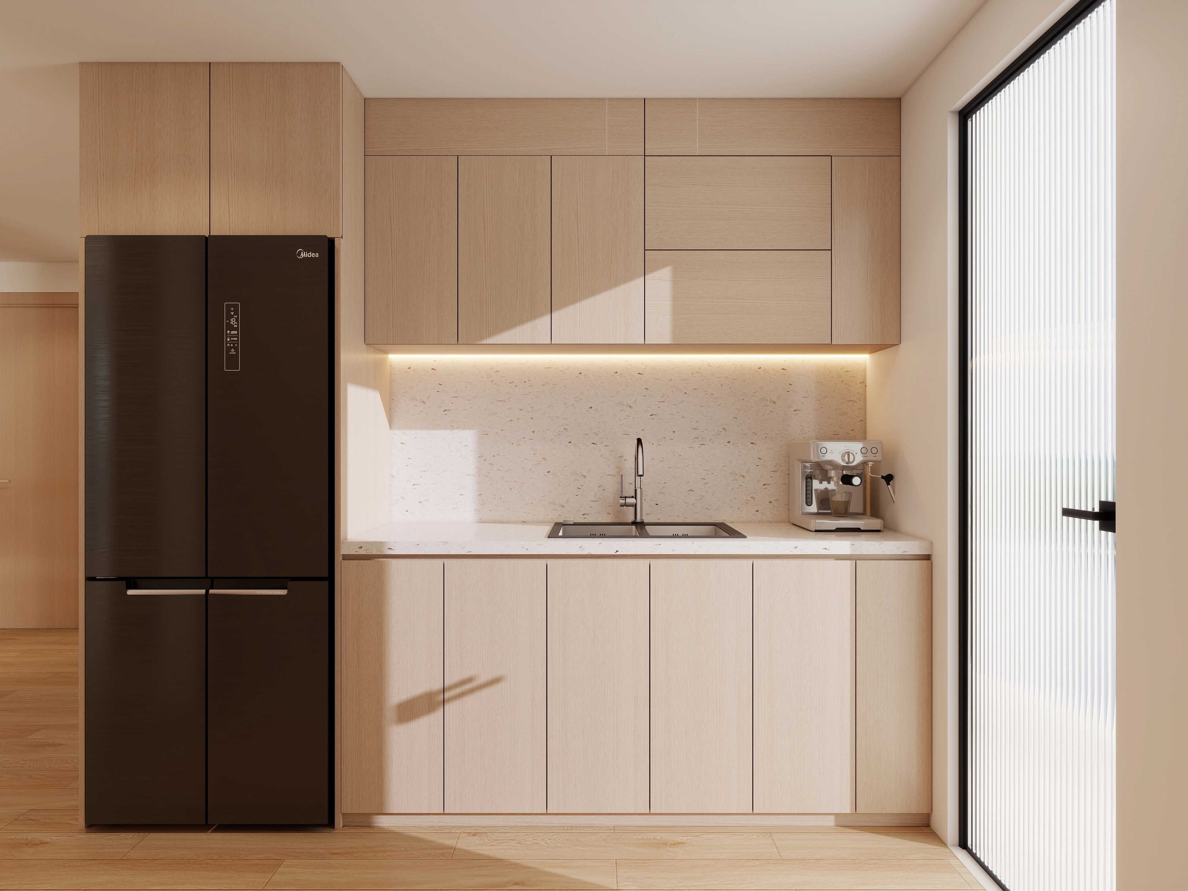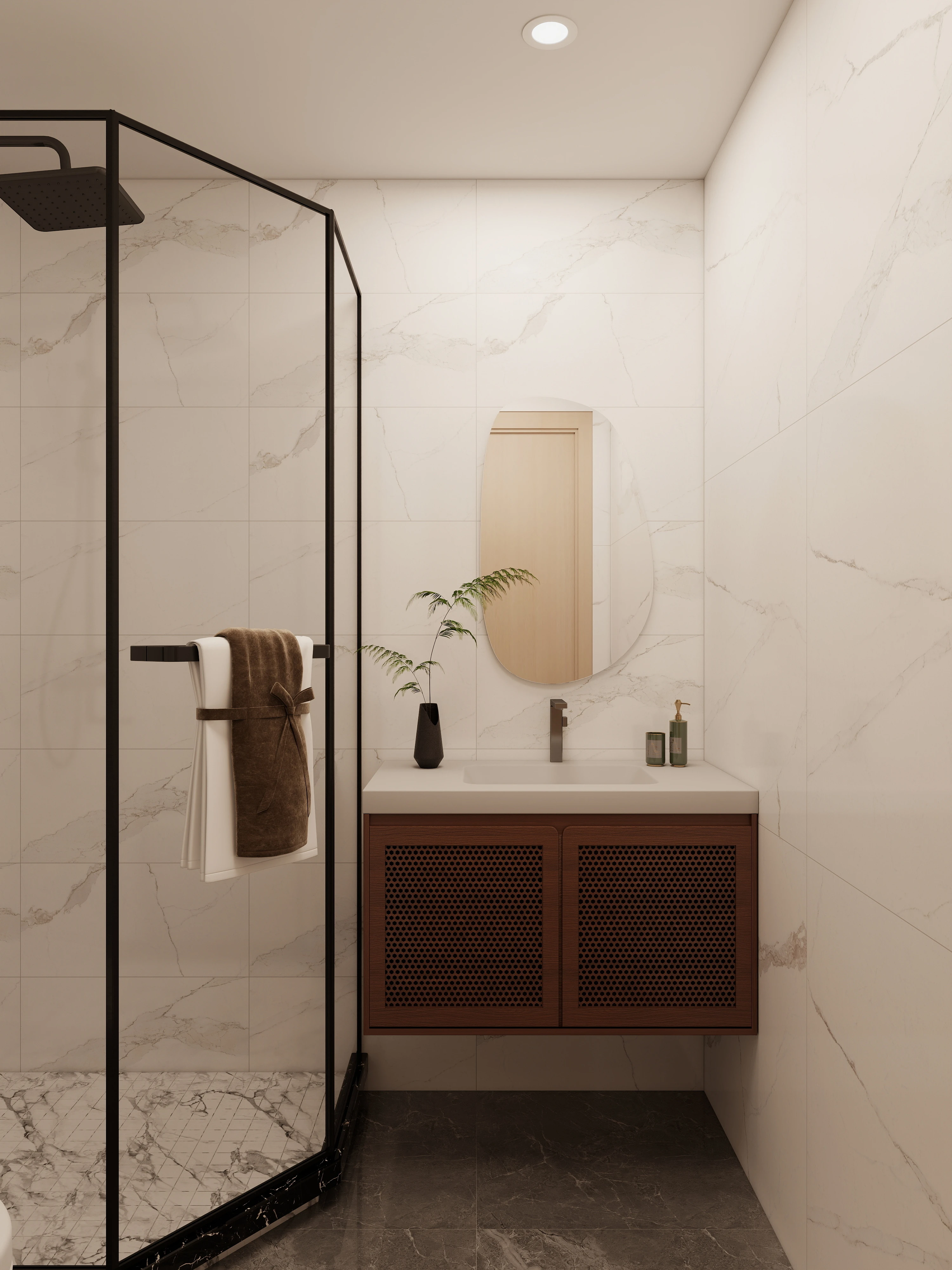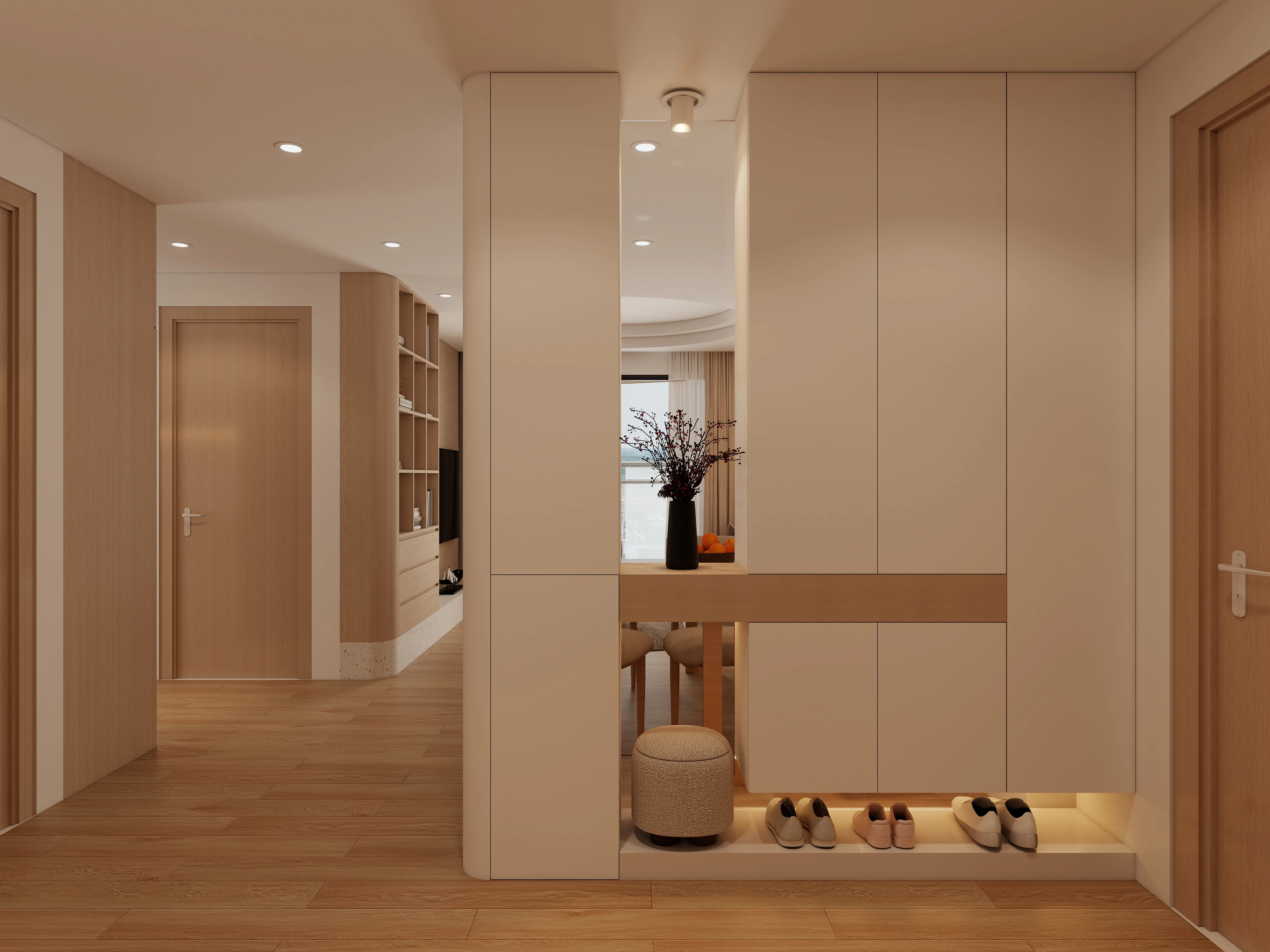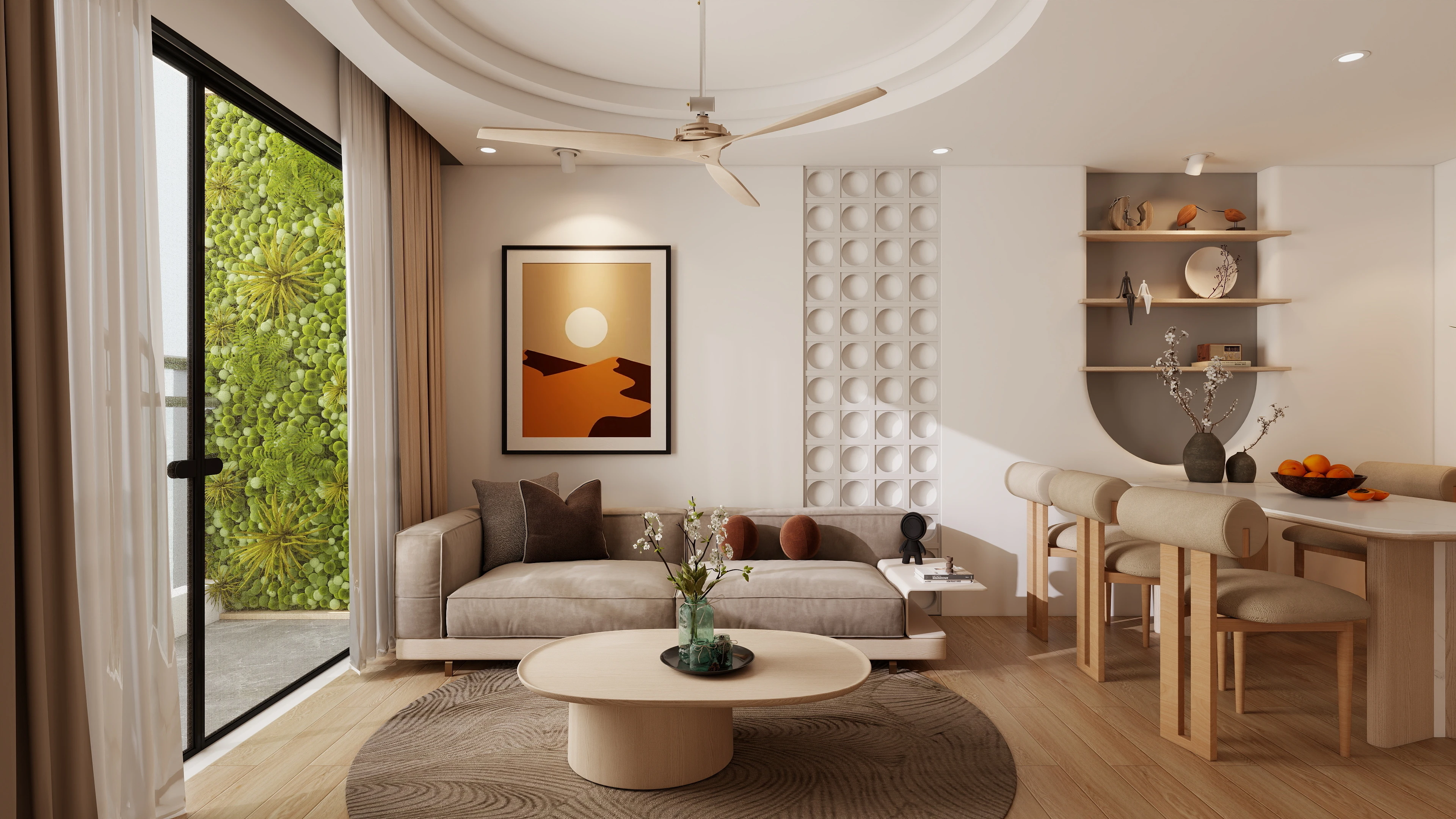 Tone màu be nhạt, trắng ngà, nâu gỗ và xanh olive nhẹ được kết hợp mượt mà để tạo nên cảm giác dễ chịu, cân bằng giữa hiện đại và thiên nhiên.