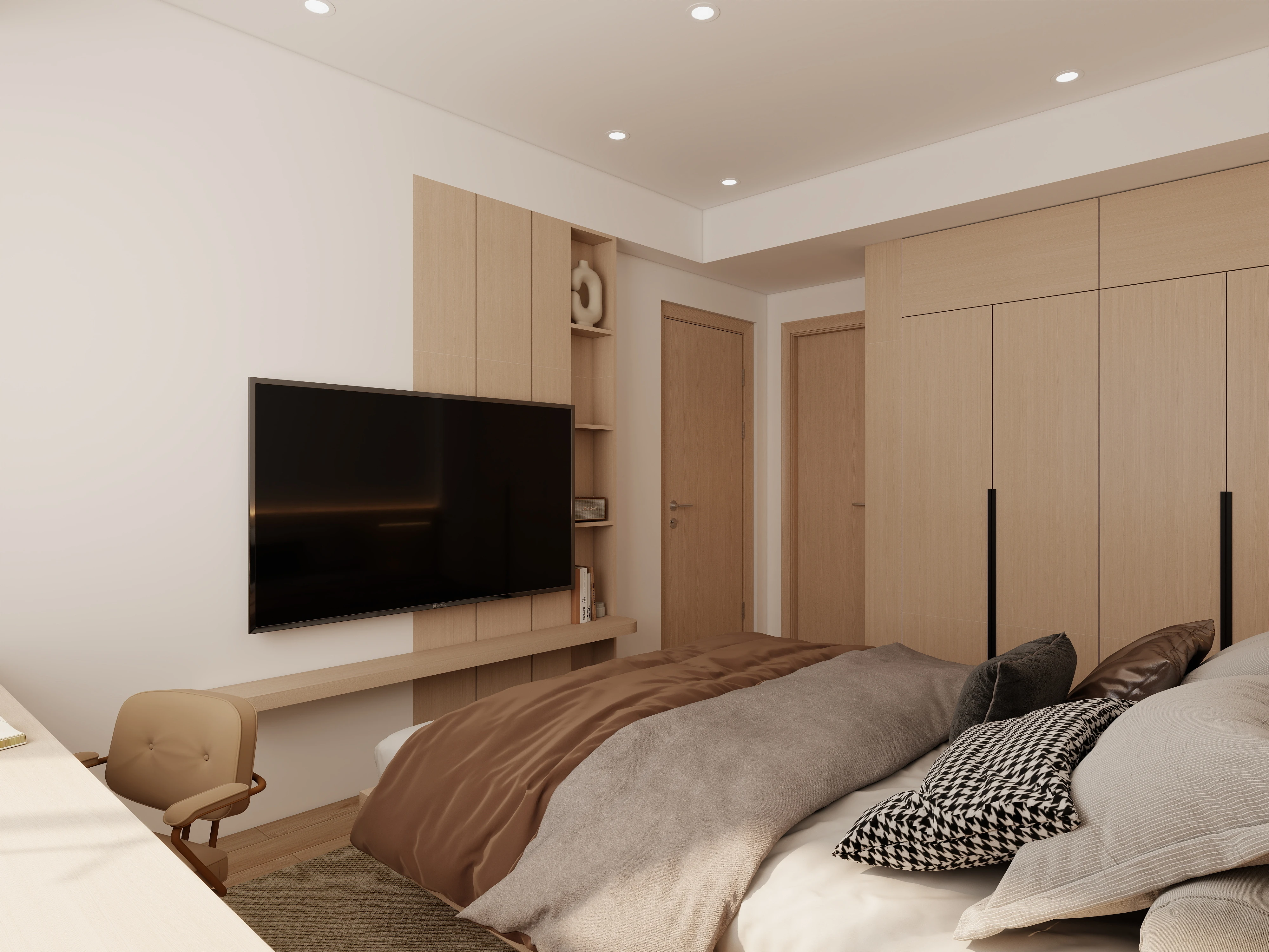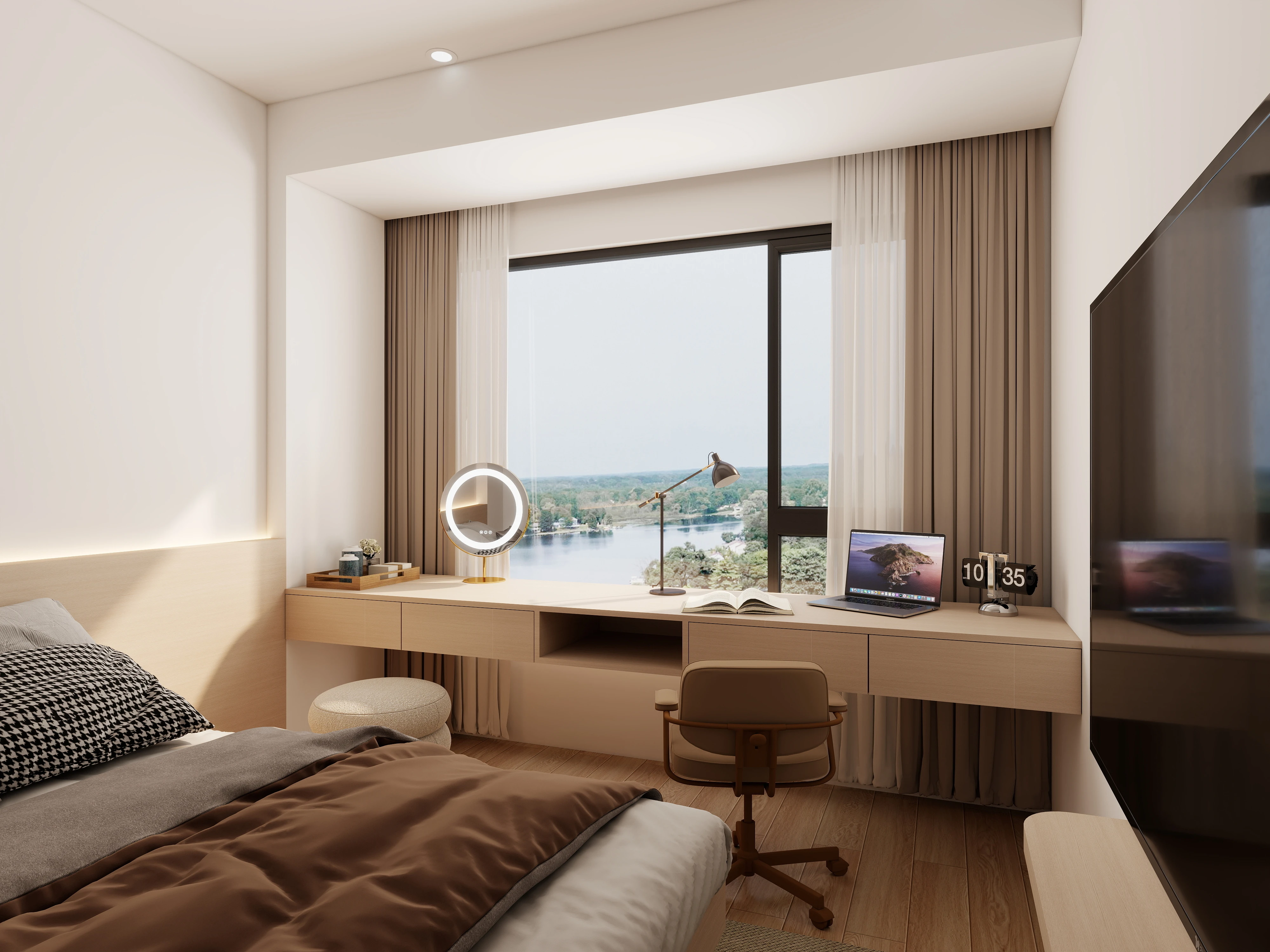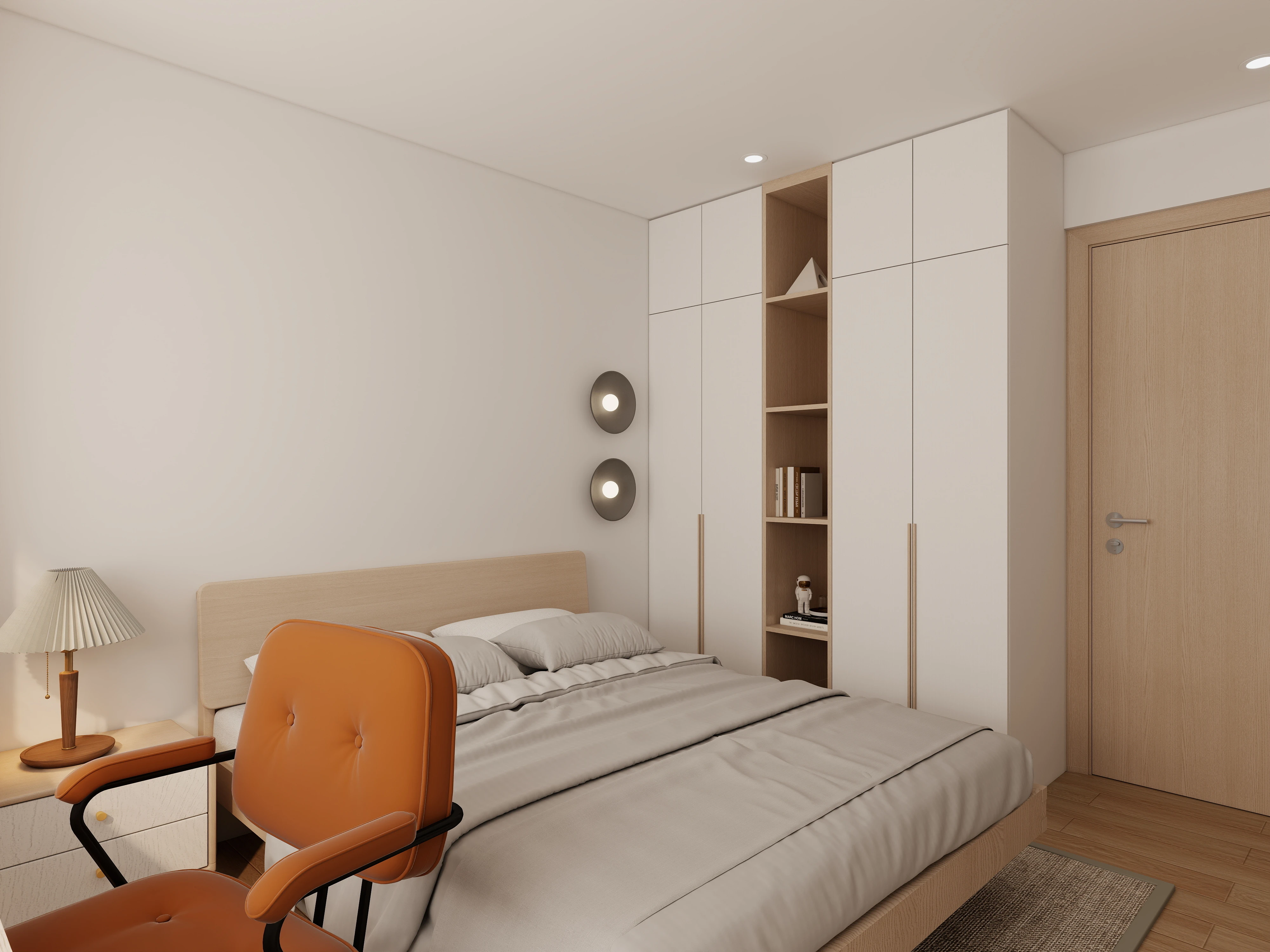 Tông màu chủ đạo: Gỗ sáng và be nhẹ tạo cảm giác nhẹ nhàng, dễ chịu cho mắt và tâm trí.
