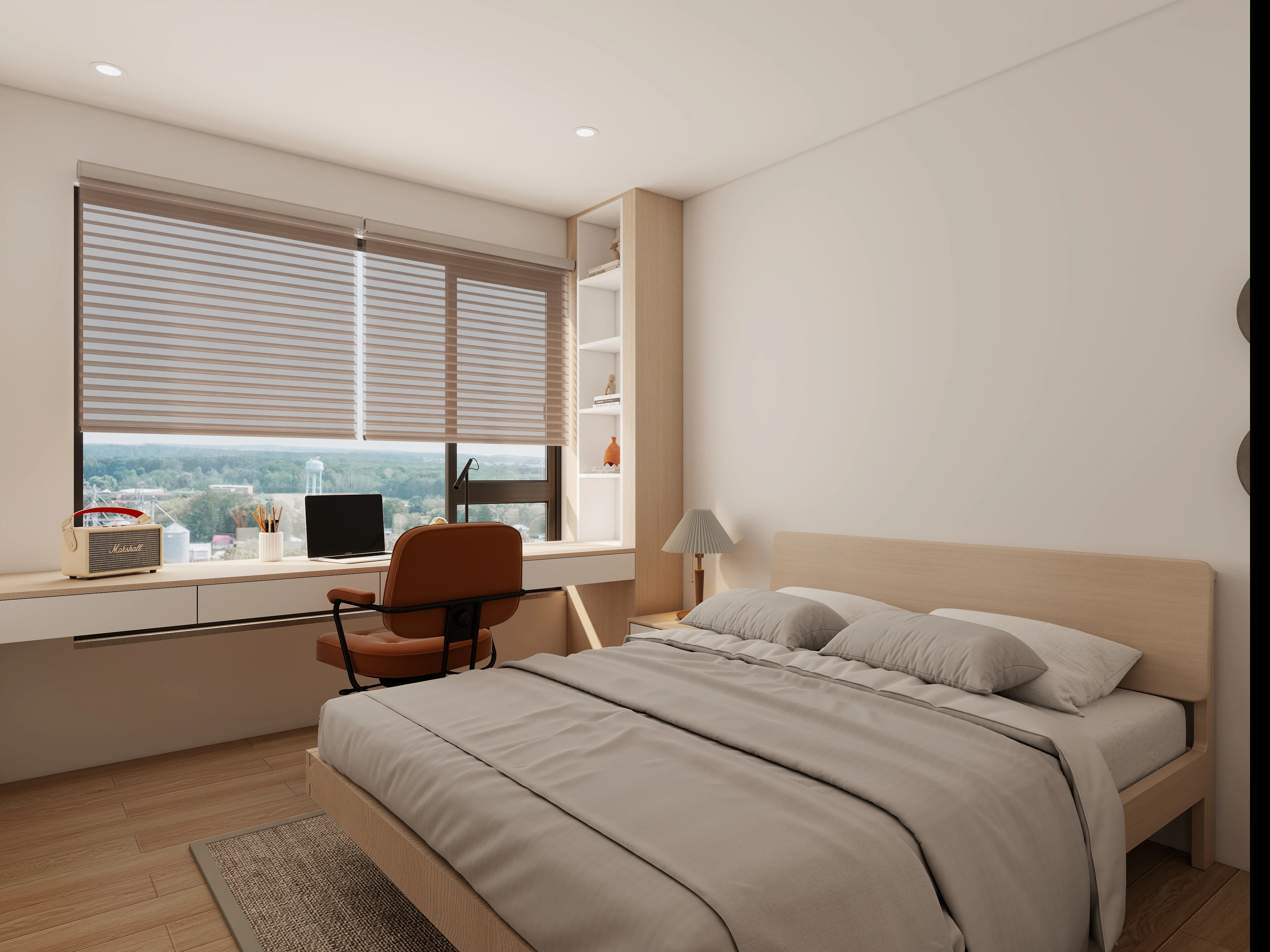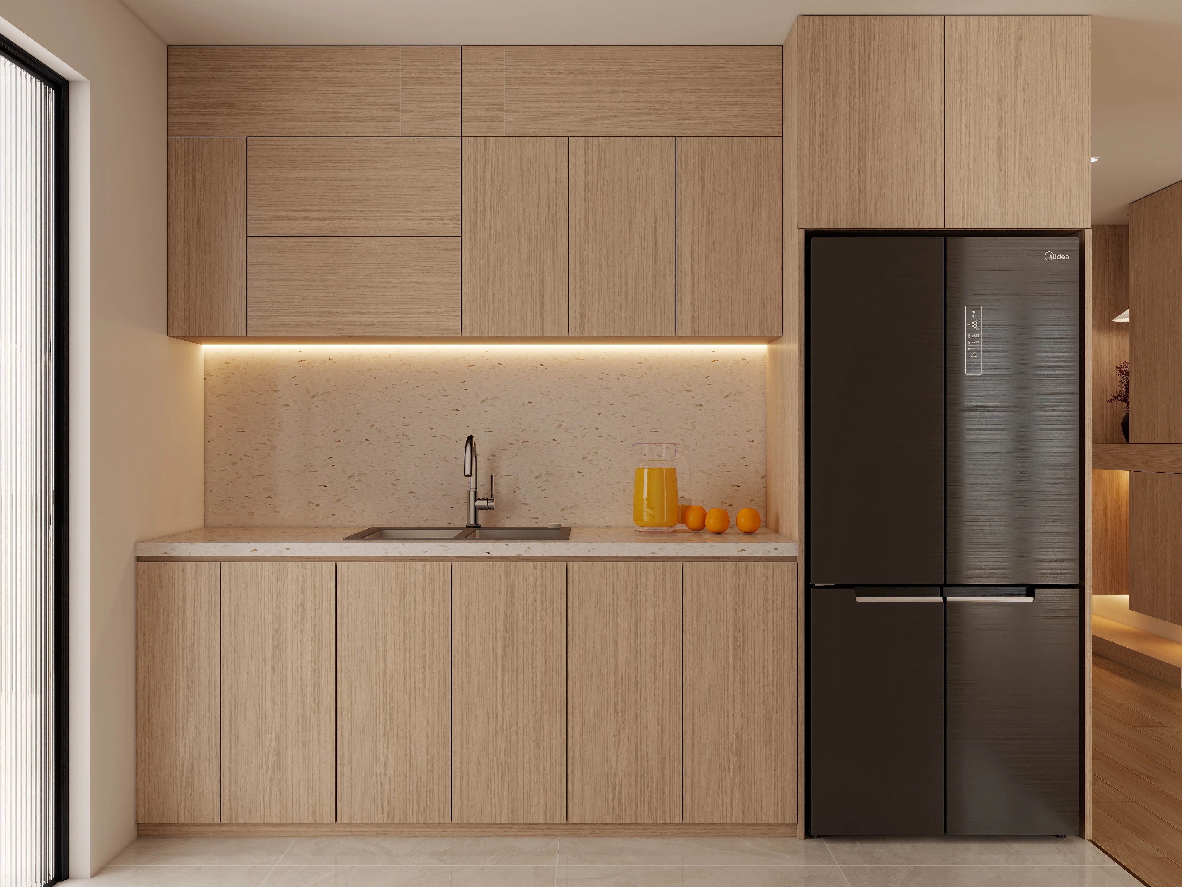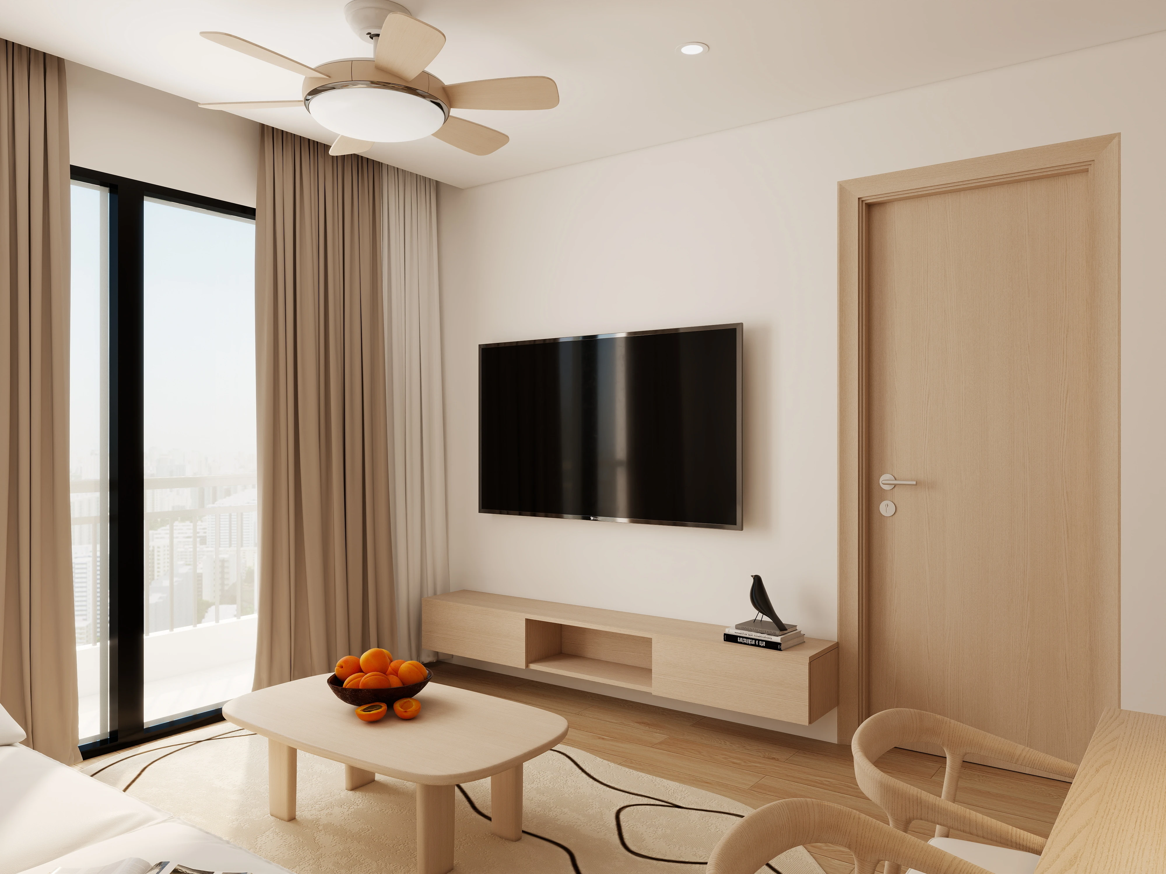 Tông màu chủ đạo: Gỗ sáng và be nhẹ tạo cảm giác nhẹ nhàng, dễ chịu cho mắt và tâm trí.