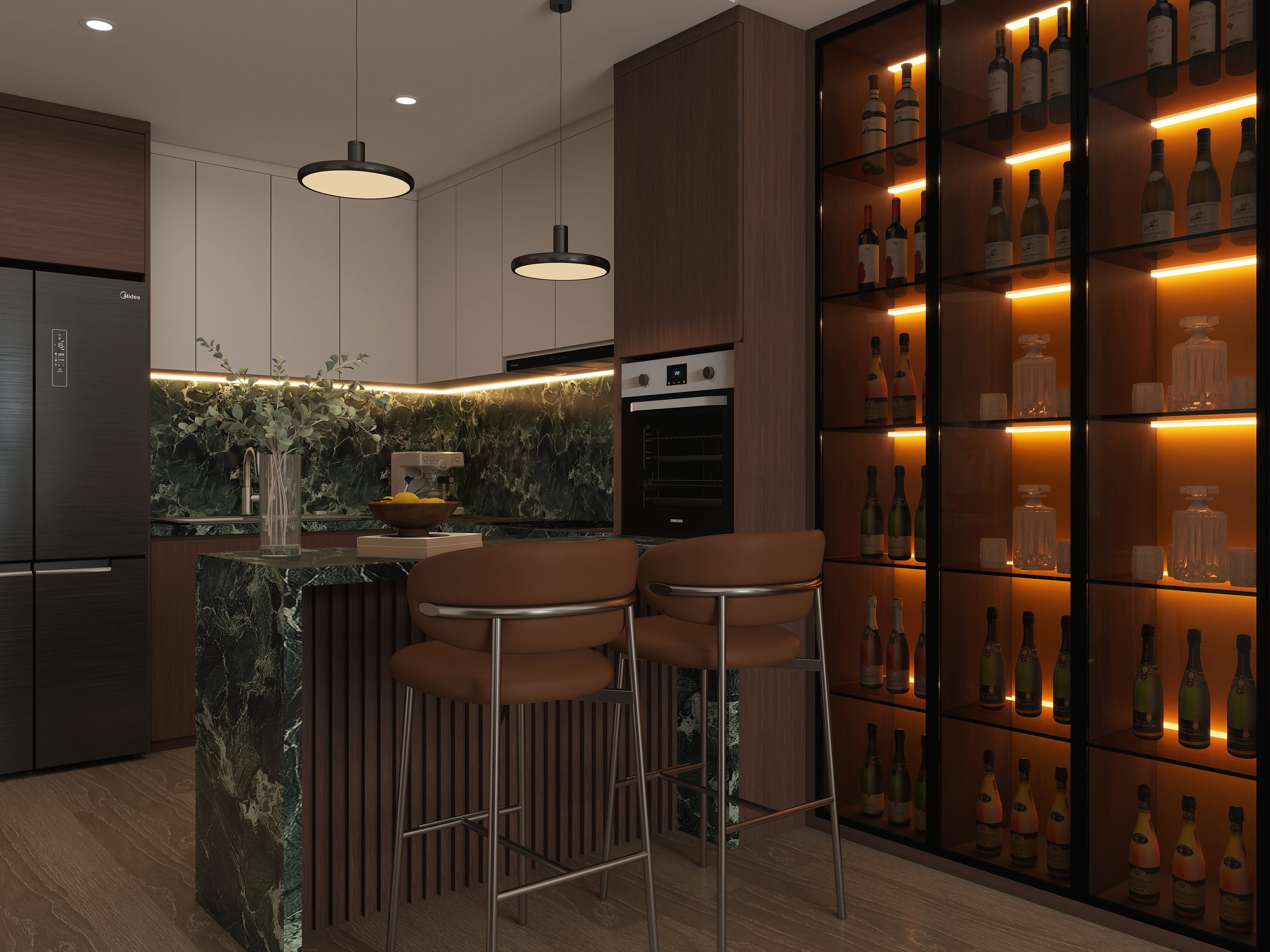 Sofa dáng thẳng bọc nỉ sang trọng chiếm vai trò trung tâm. Bàn cà phê tròn mặt kính tối màu kết hợp với các món décor nhỏ: bình gốm, sách, hoa khô… được tiết chế vừa phải, tránh tạo cảm giác bừa bộn.