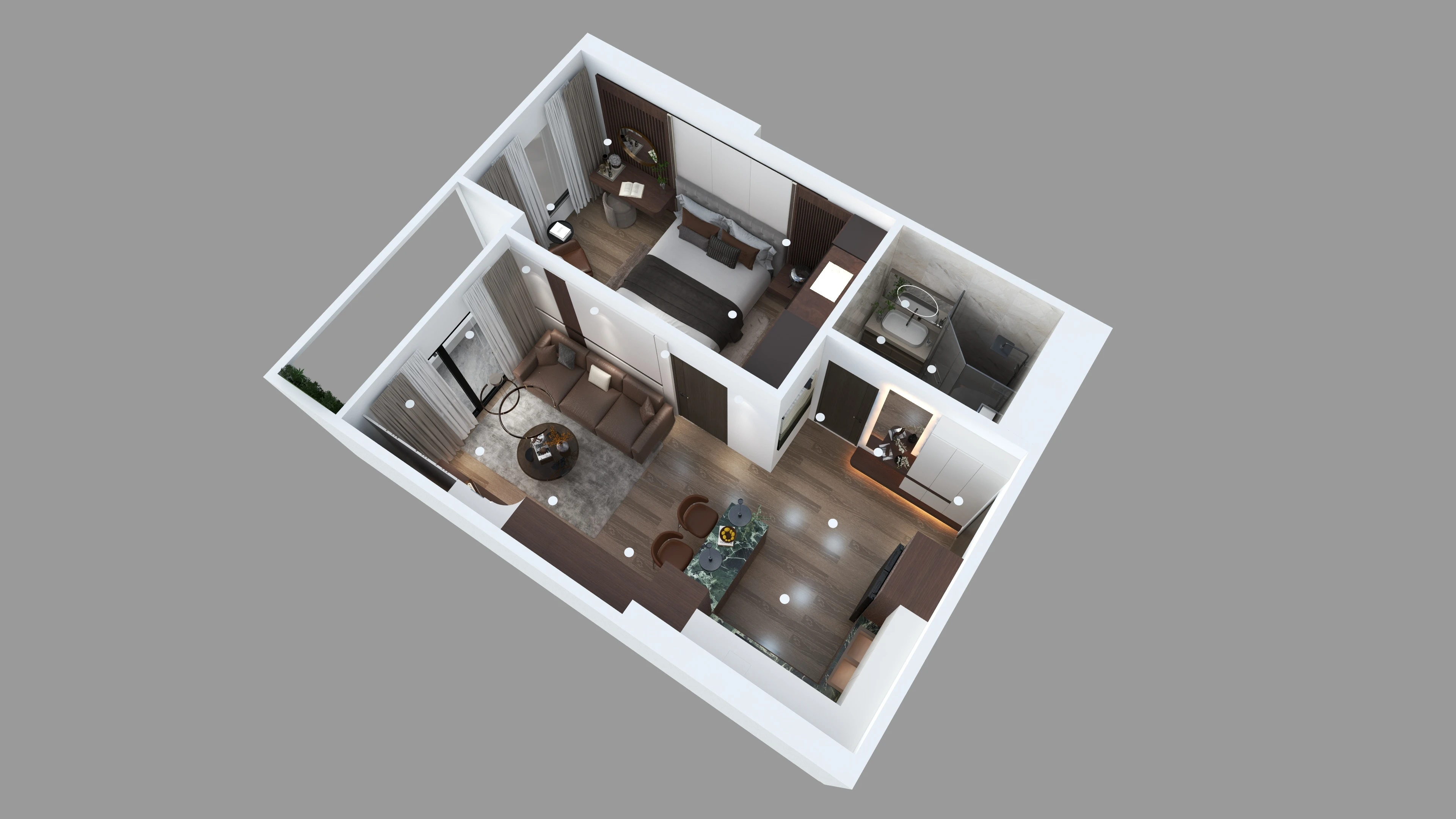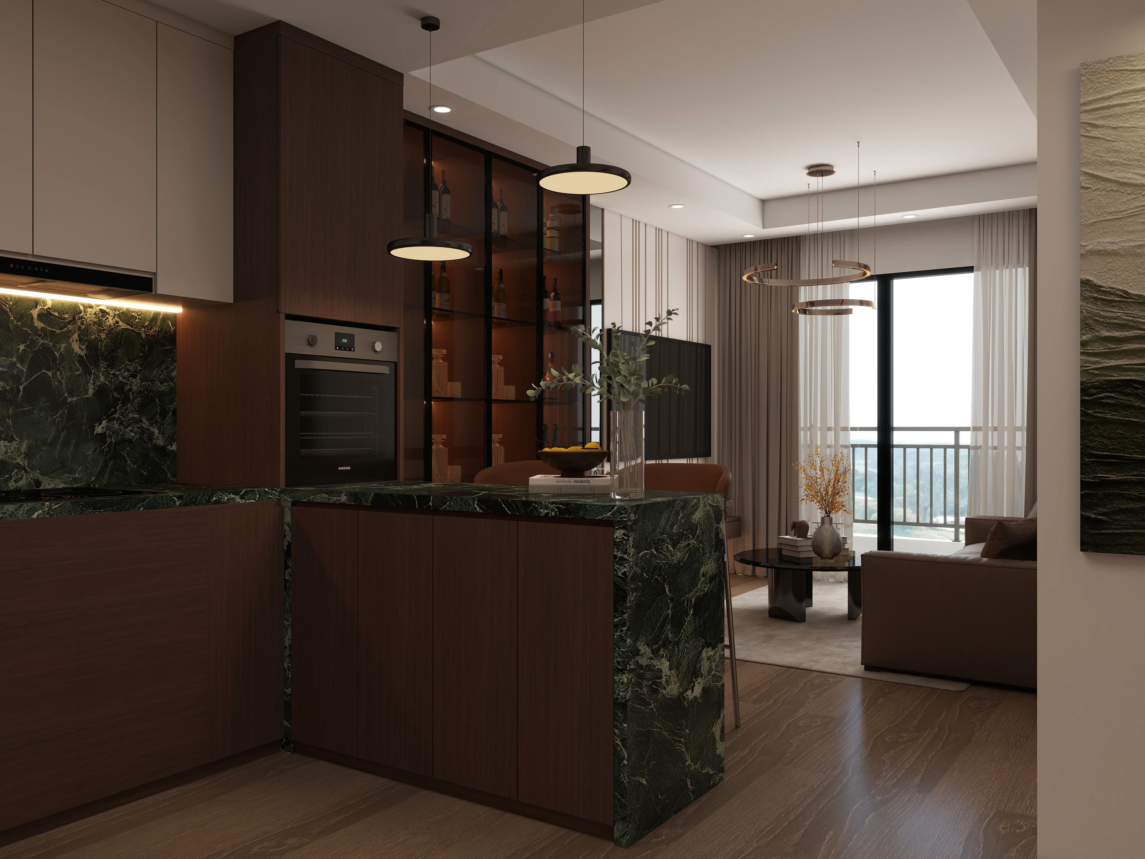 Không gian phòng khách được thiết kế với tiêu chí tối ưu diện tích nhưng vẫn đảm bảo cảm giác rộng rãi và sang trọng. Bảng màu trung tính – nâu, be và trắng sữa – tạo sự thư giãn và nhẹ nhàng cho thị giác.