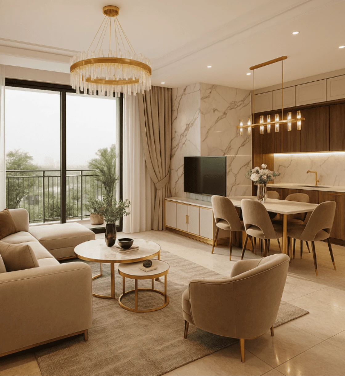 Kết hợp đá vân mây, gỗ tự nhiên màu nâu sậm, ánh kim gold và các gam beige – tạo nên một bảng màu cân bằng, quý phái nhưng không phô trương.