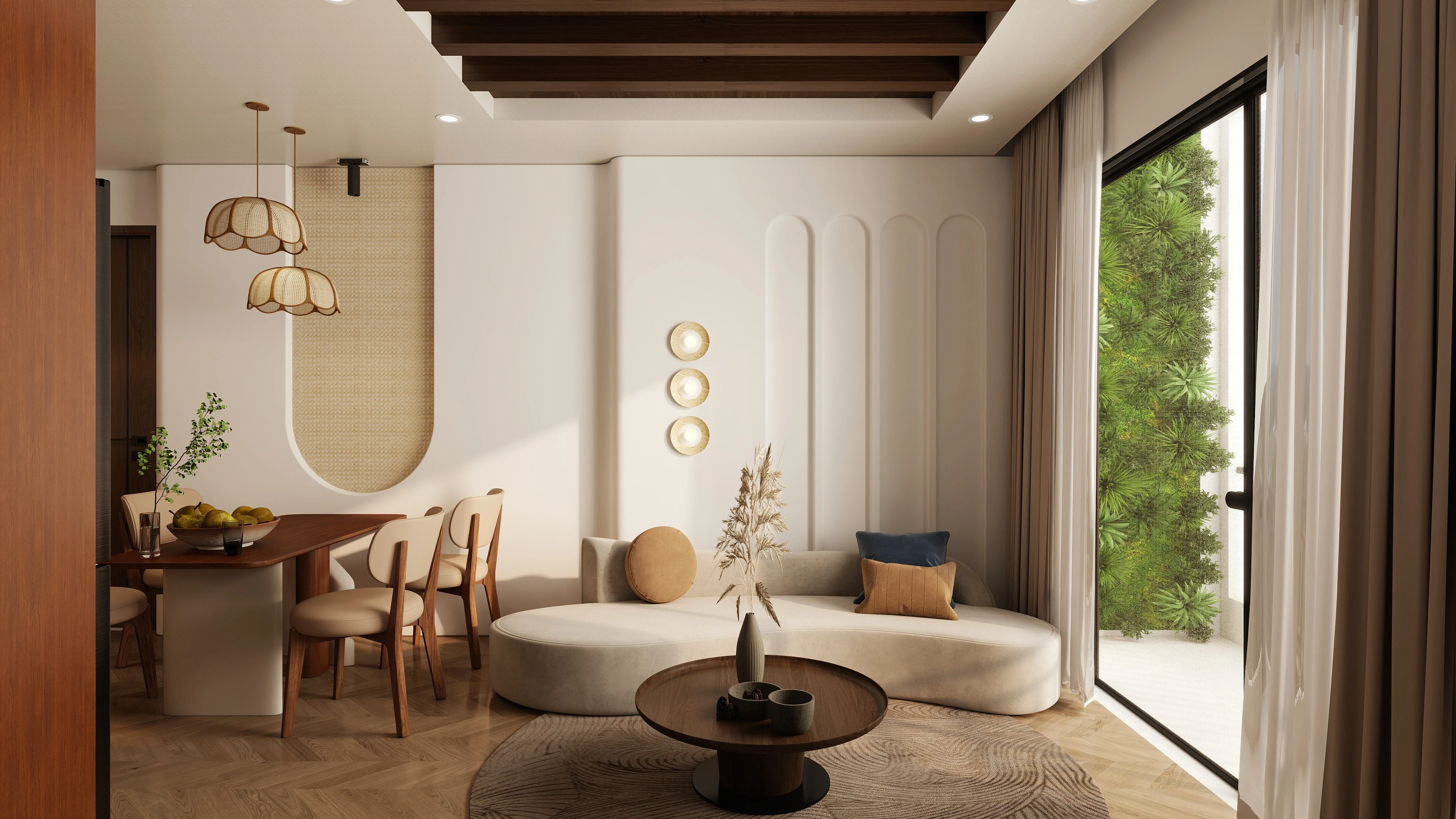 MKL Interior giới thiệu thiết kế phòng khách kết hợp bàn ăn theo phong cách Wabi Sabi – nơi vẻ đẹp đến từ sự giản dị, mộc mạc và gần gũi thiên nhiên.