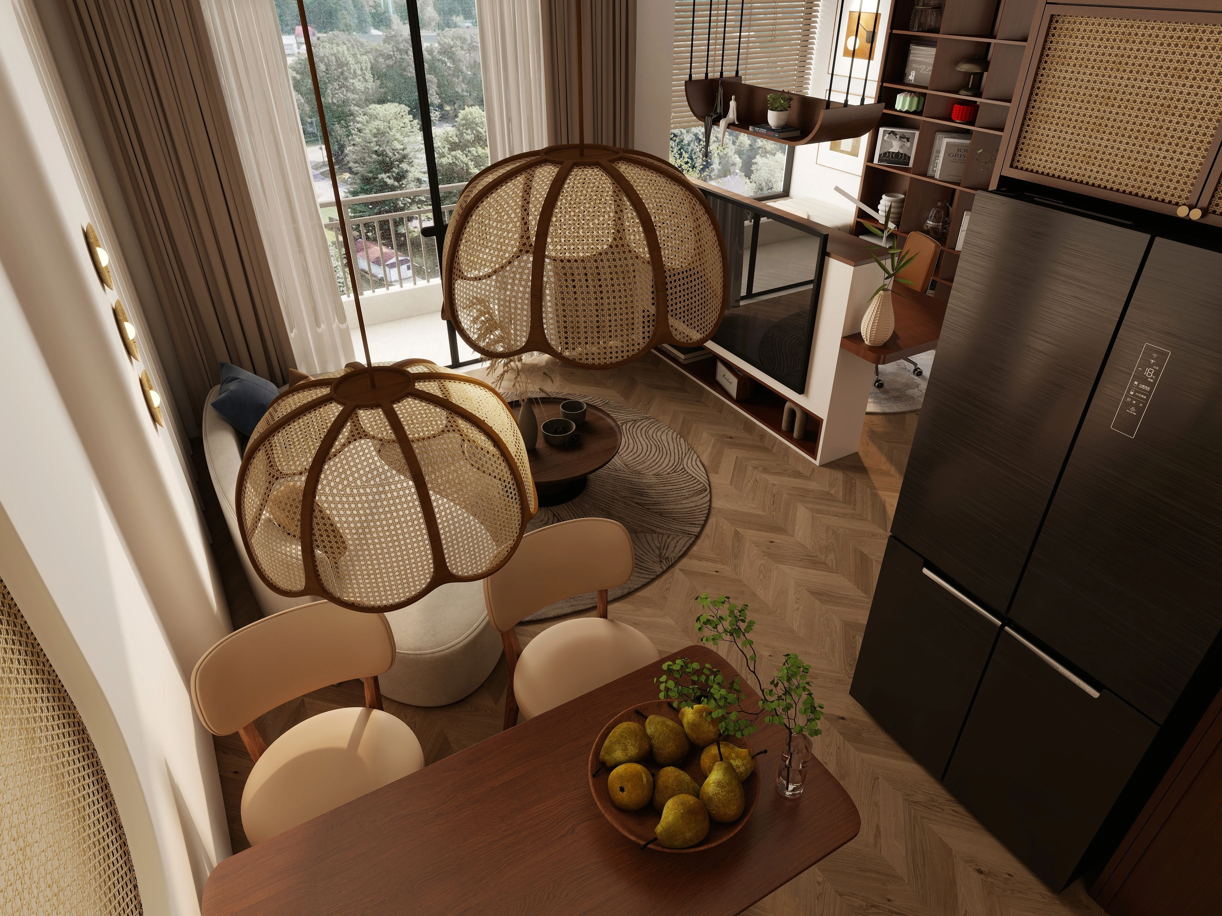 Khu vực bàn ăn sử dụng chất liệu gỗ tự nhiên, tông ấm, tinh tế.