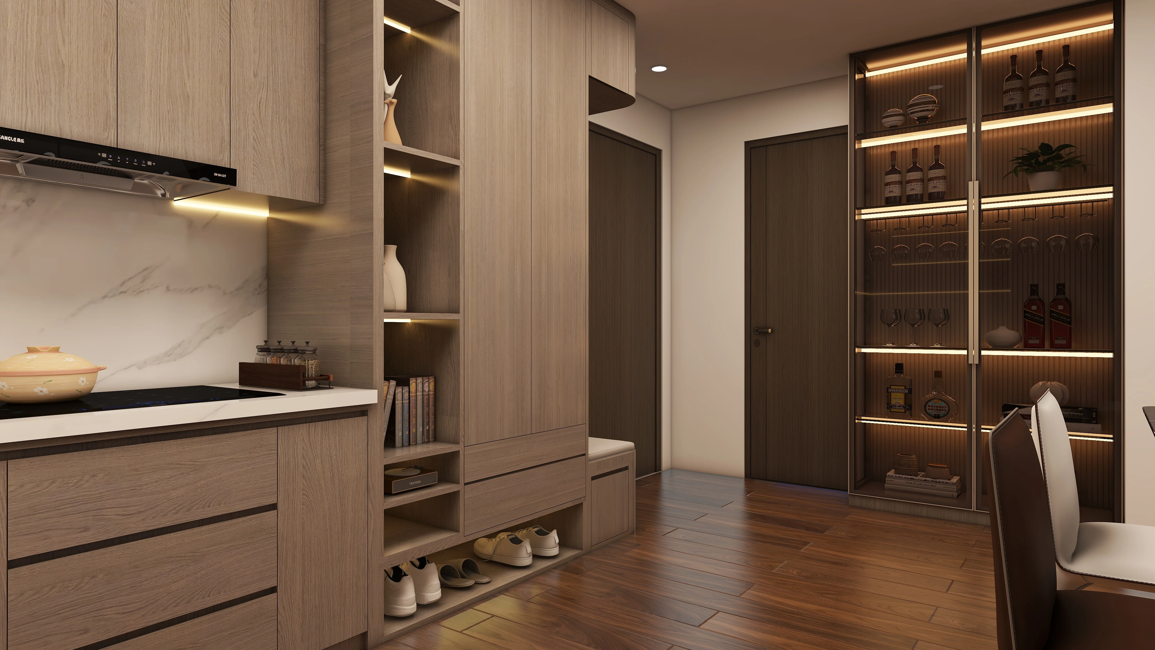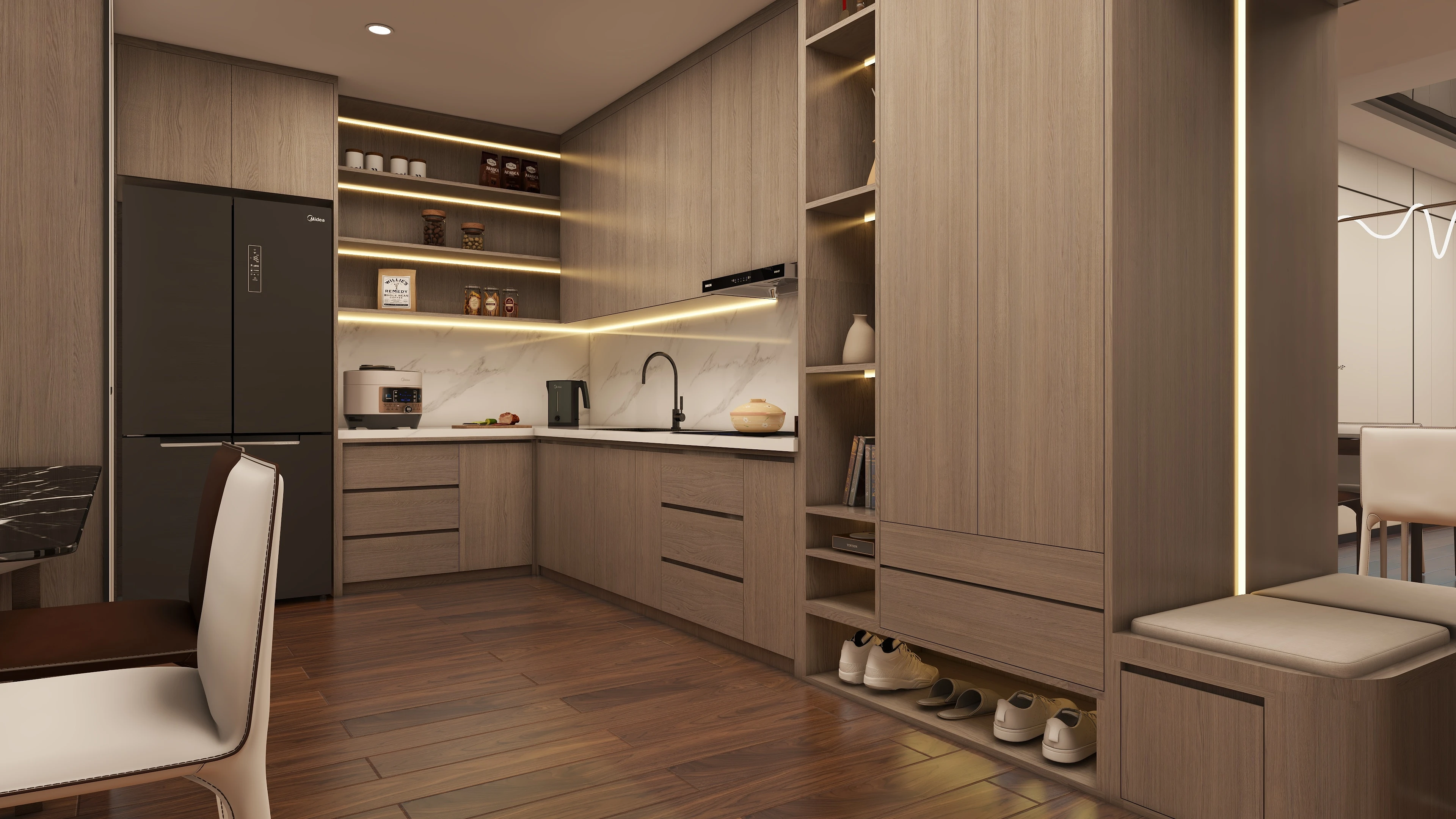 🎨 Vách tường đồng bộ – liền mạch tổng thể: Toàn bộ hệ tủ và vách tường ốp gỗ dọc cùng mảng tường sáng phía sau giúp mở rộng không gian thị giác và mang lại sự sang trọng tối giản.
