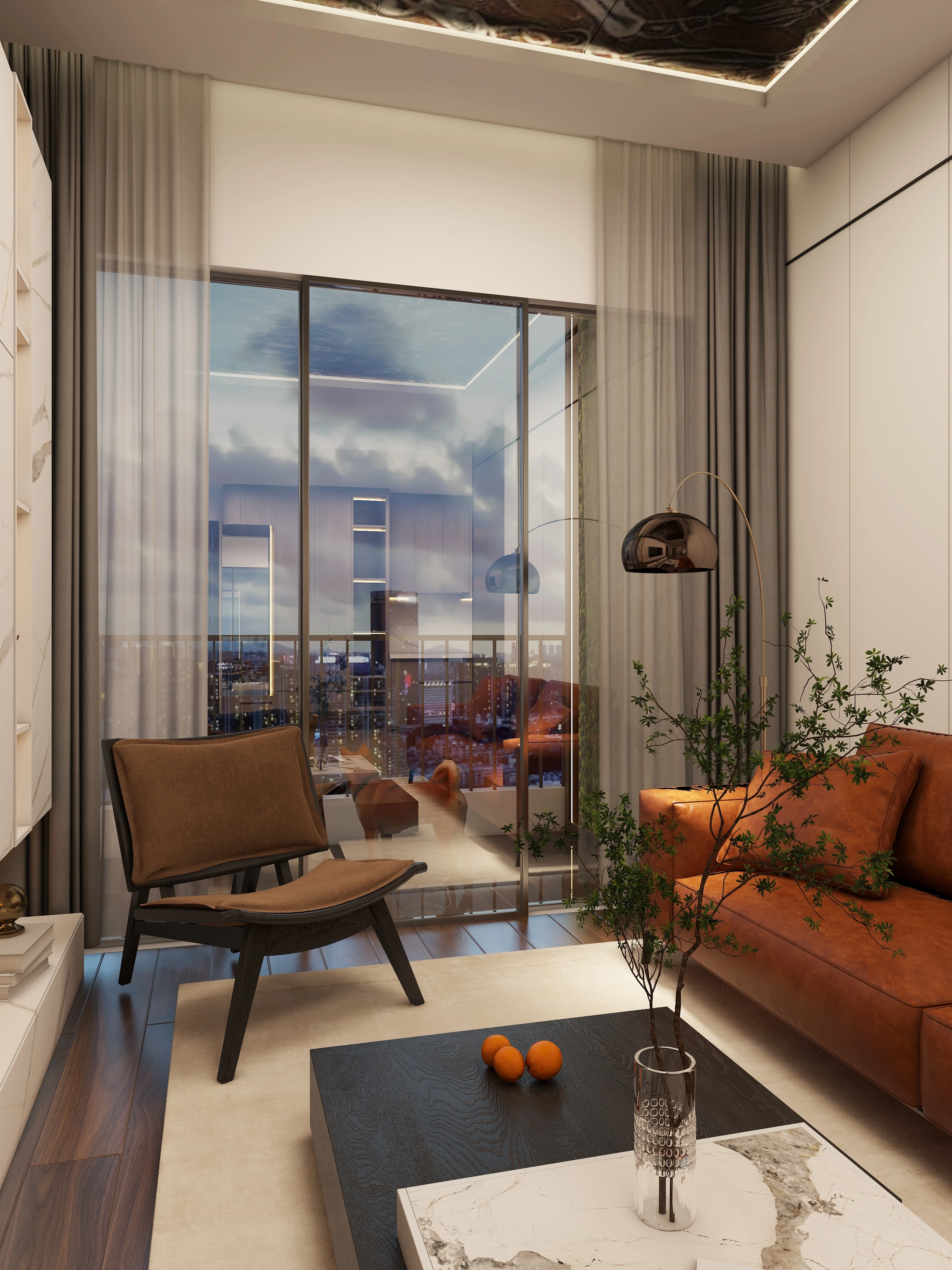 🛋️ Phòng khách hiện đại, bố cục thông minh: Ghế sofa da nâu nổi bật tạo điểm nhấn mạnh mẽ giữa gam màu trung tính. Kết hợp cùng bàn trà thấp, thảm lông và ánh sáng dịu – không gian trở nên vừa ấm cúng, vừa sang trọng.