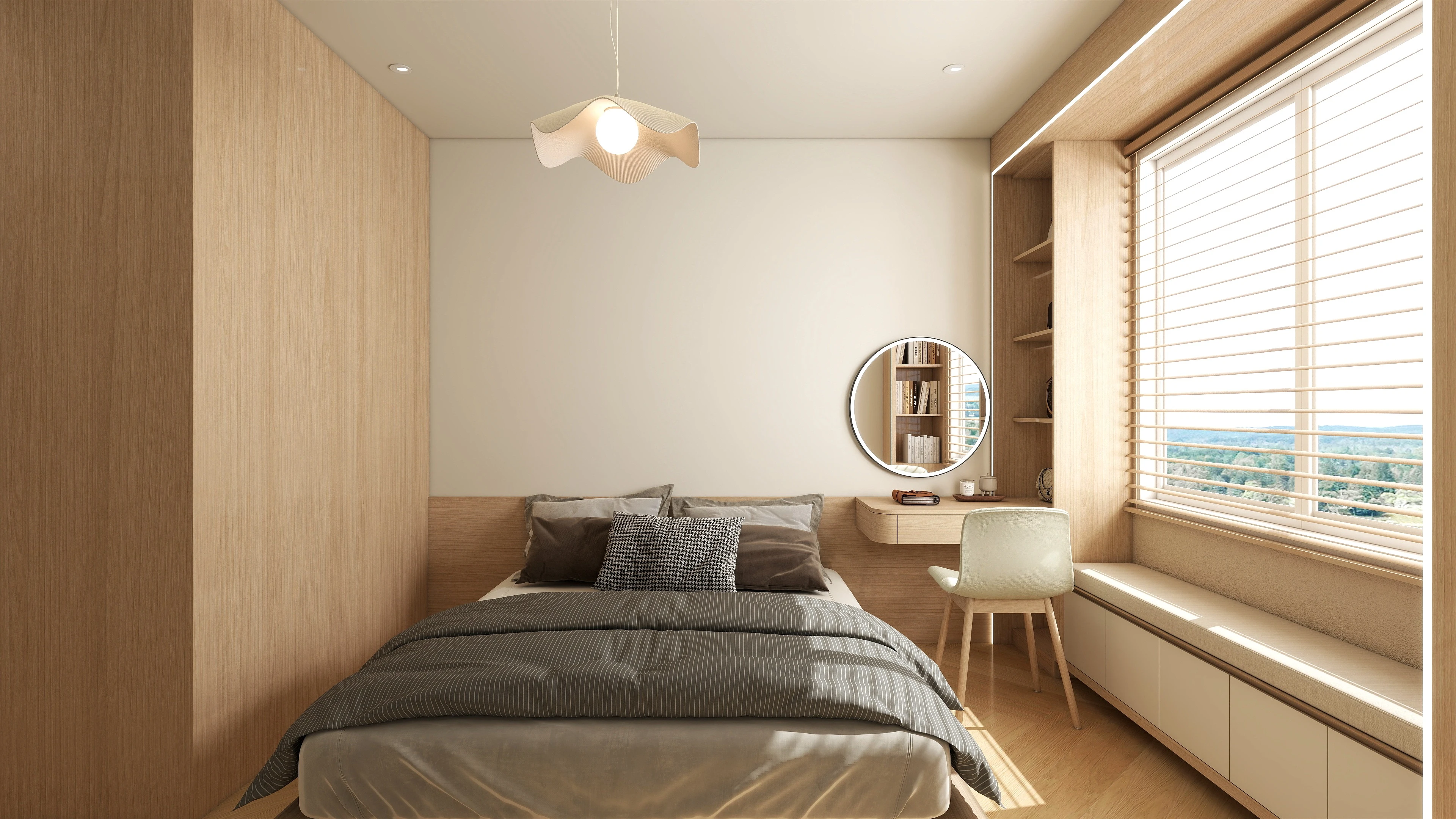 Thiết kế giường sát đất, đầu giường tích hợp cùng khu vực làm việc vừa tiện nghi vừa tiết kiệm diện tích. Bộ chăn ga trung tính tăng thêm phần êm dịu và thoải mái cho giấc ngủ sâu.