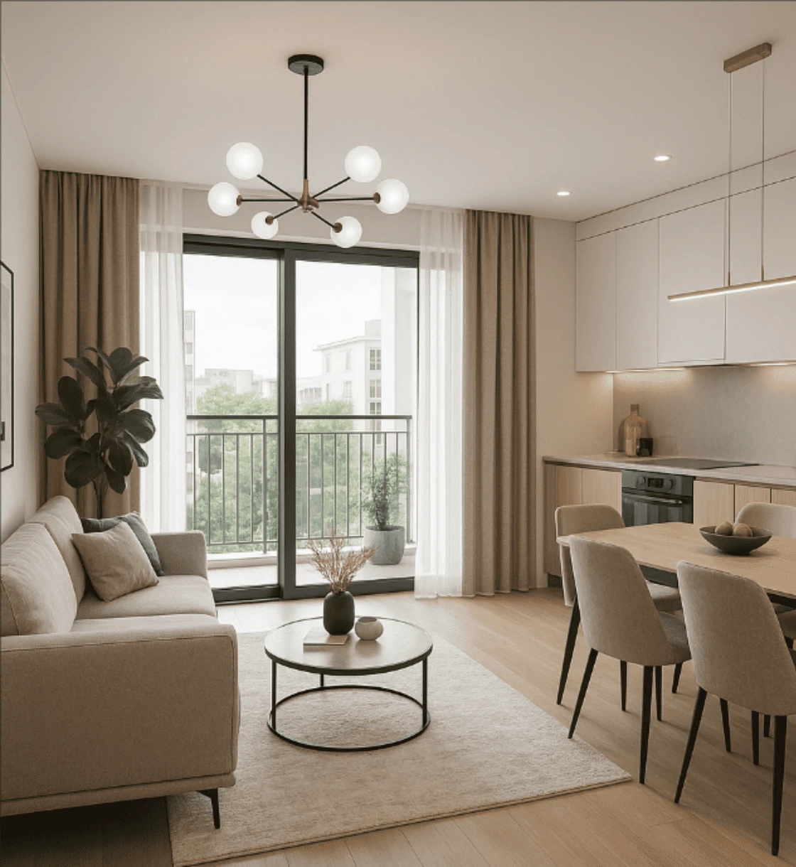 MKL Interior mang đến mẫu thiết kế phòng khách kết hợp bếp lý tưởng cho căn hộ hiện đại, theo phong cách Scandinavian – tối giản, tinh tế và chan hòa ánh sáng.