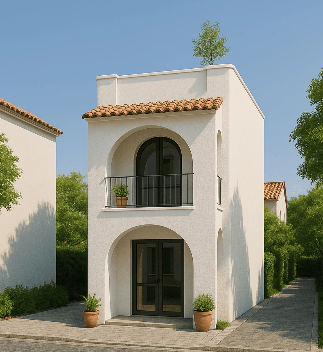 Mẫu nhà phù hợp với lô đất nhỏ trong phố, ngang 5m – sâu từ 10–12m. Dù diện tích hạn chế, thiết kế tận dụng chiều cao và hình khối vòm mở rộng không gian, tạo cảm giác rộng rãi, nhẹ nhàng như một biệt thự nghỉ dưỡng mini.