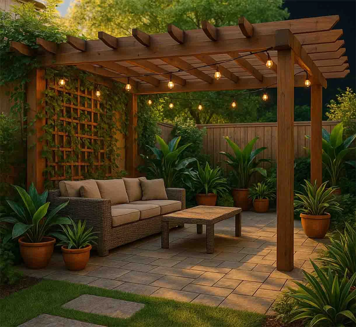 Sofa mây êm ái dưới giàn gỗ lắp đèn dây ánh vàng tạo nên không gian chill đúng chuẩn resort tại gia – lý tưởng cho những buổi chiều thảnh thơi.